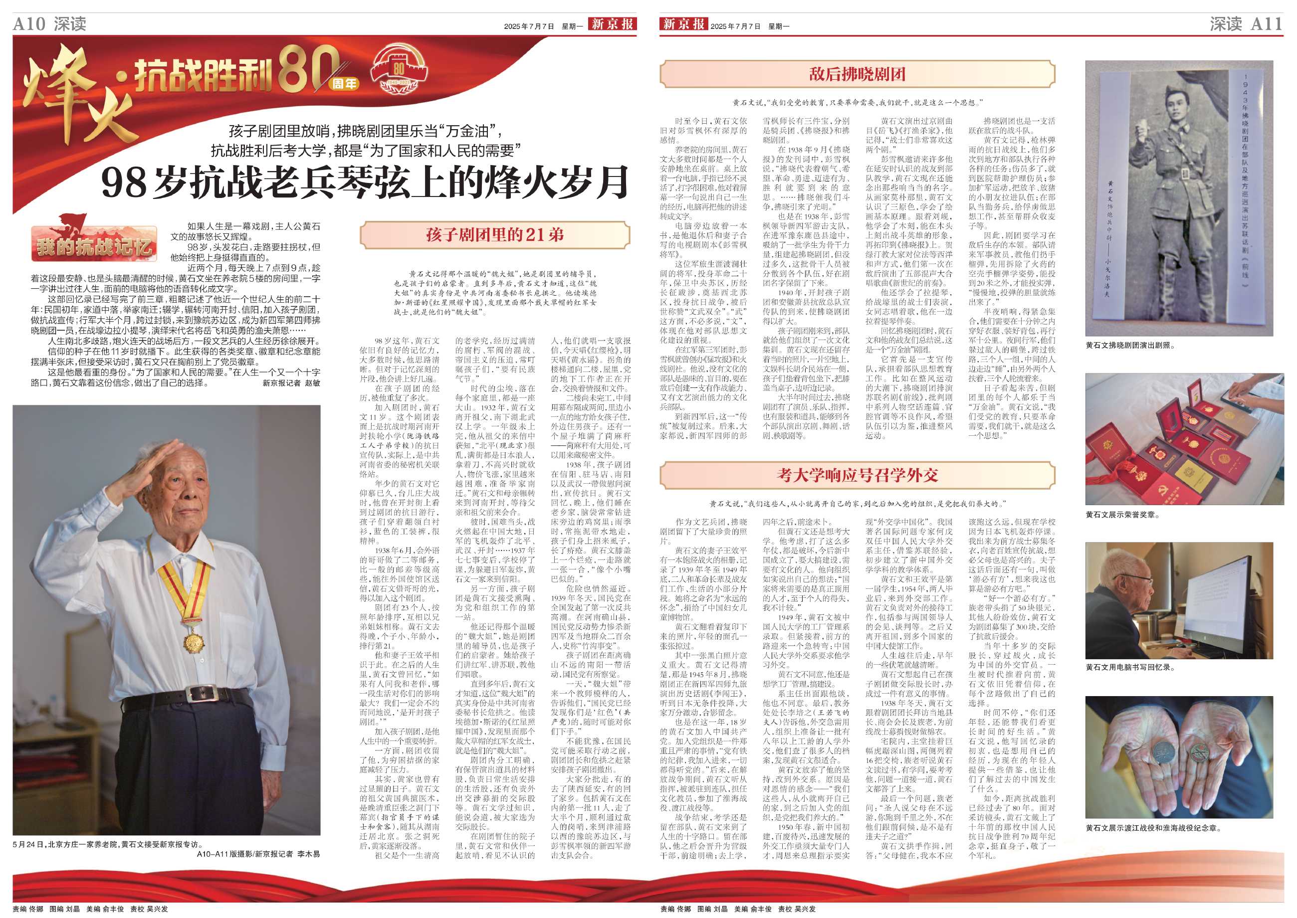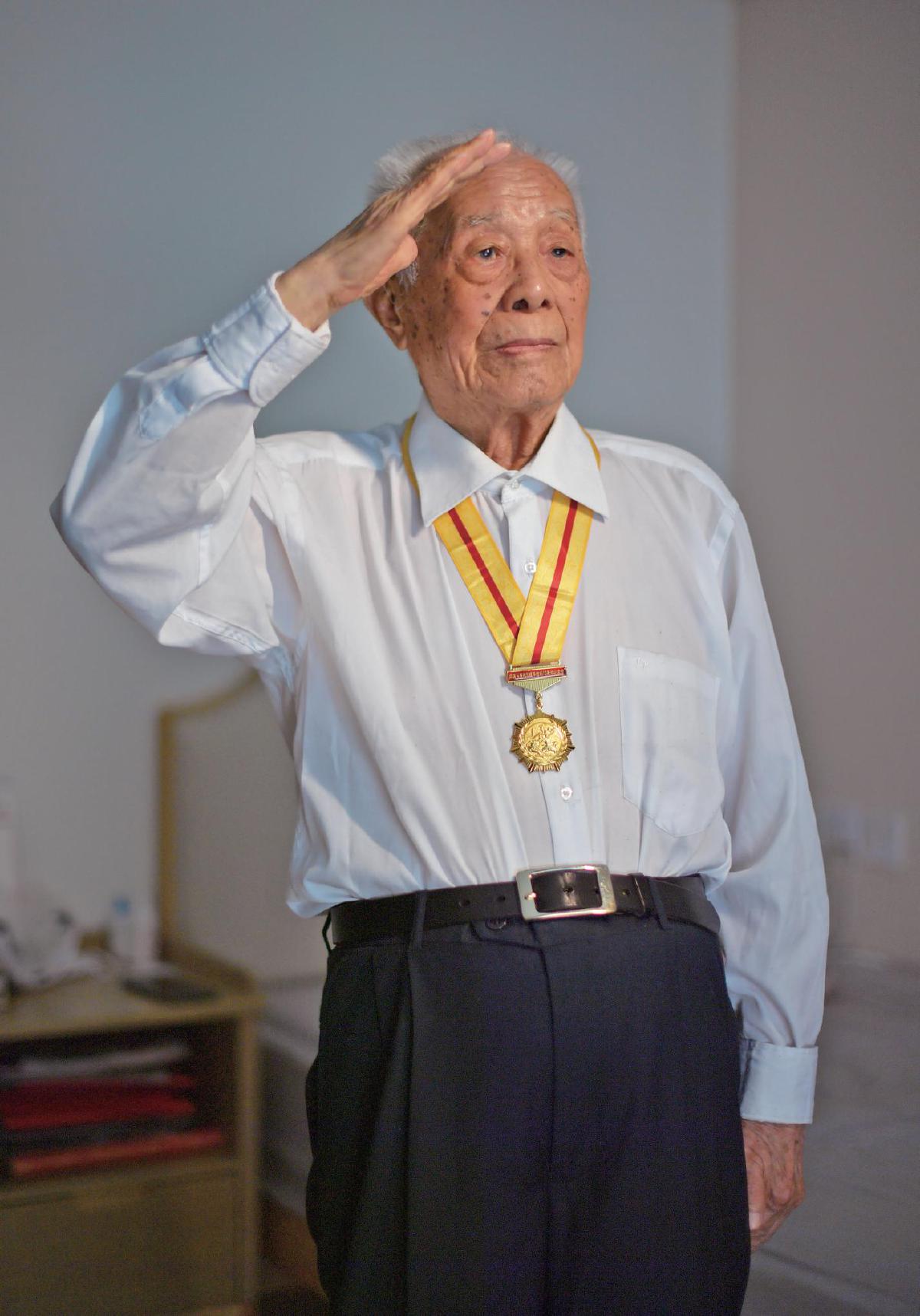 如今,距离抗战胜利已经过去了80年。面对采访镜头,黄石文戴上了十年前的那枚中国人民抗日战争胜利70周年纪念章,挺直身子,敬了一个军礼。