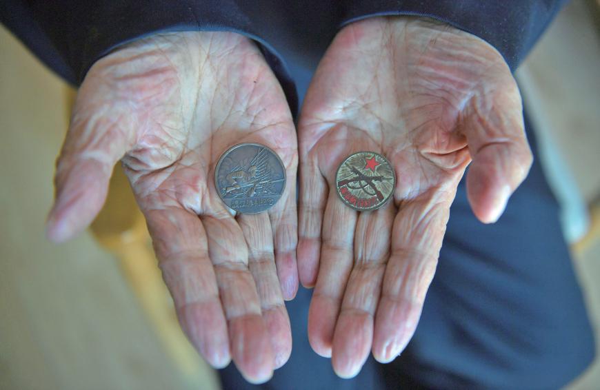 黄石文展示渡江战役和淮海战役纪念章。