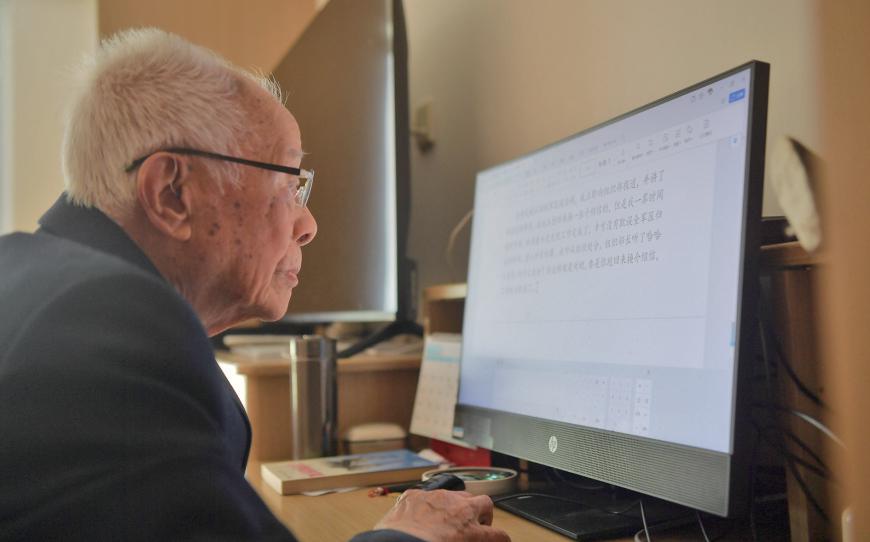 黄石文用电脑书写回忆录。