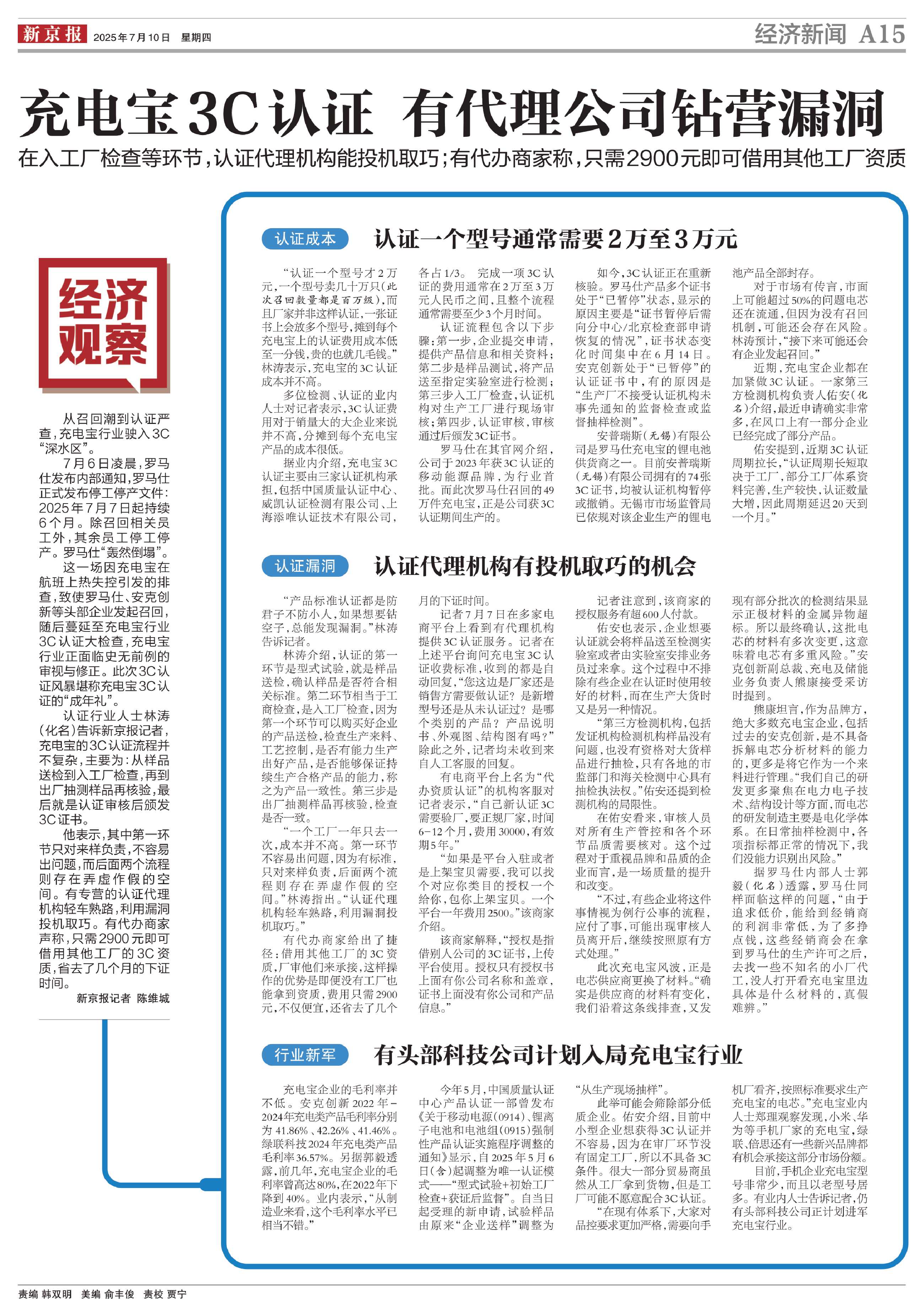 “认证一个型号才2万元,一个型号卖几十万只(此次召回数量都是百万级),而且厂家并非这样认证,一张证书上会放多个型号,摊到每个充电宝上的认证费用成本低至一分钱,贵的也就几毛钱。”林涛表示,充电宝的3C认证成本并不高。