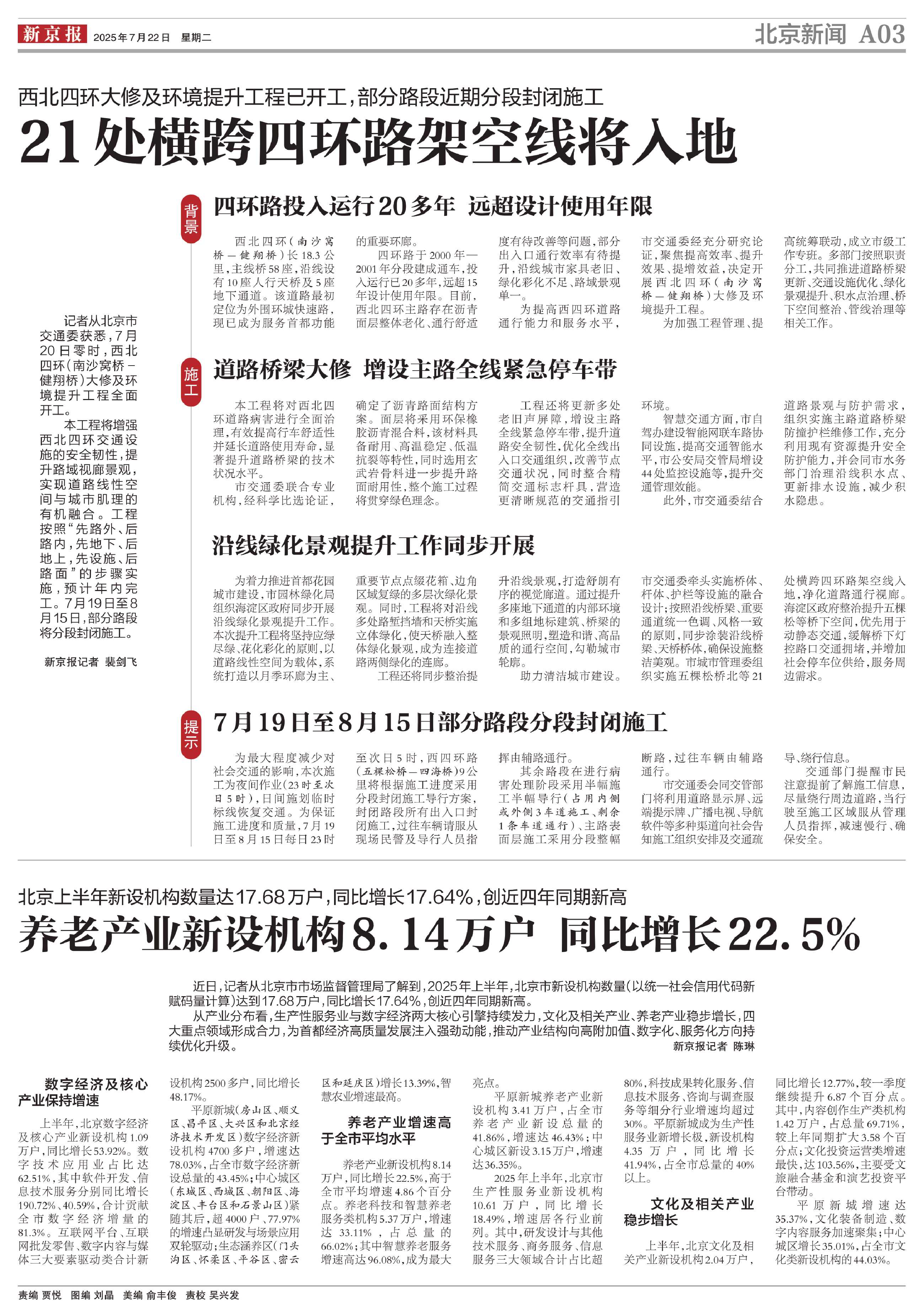 本工程将增强西北四环交通设施的安全韧性,提升路域视廊景观,实现道路线性空间与城市肌理的有机融合。工程按照“先路外、后路内,先地下、后地上,先设施、后路面”的步骤实施,预计年内完工。7月19日至8月15日,部分路段将分段封闭施工。 新京报记者 裴剑飞