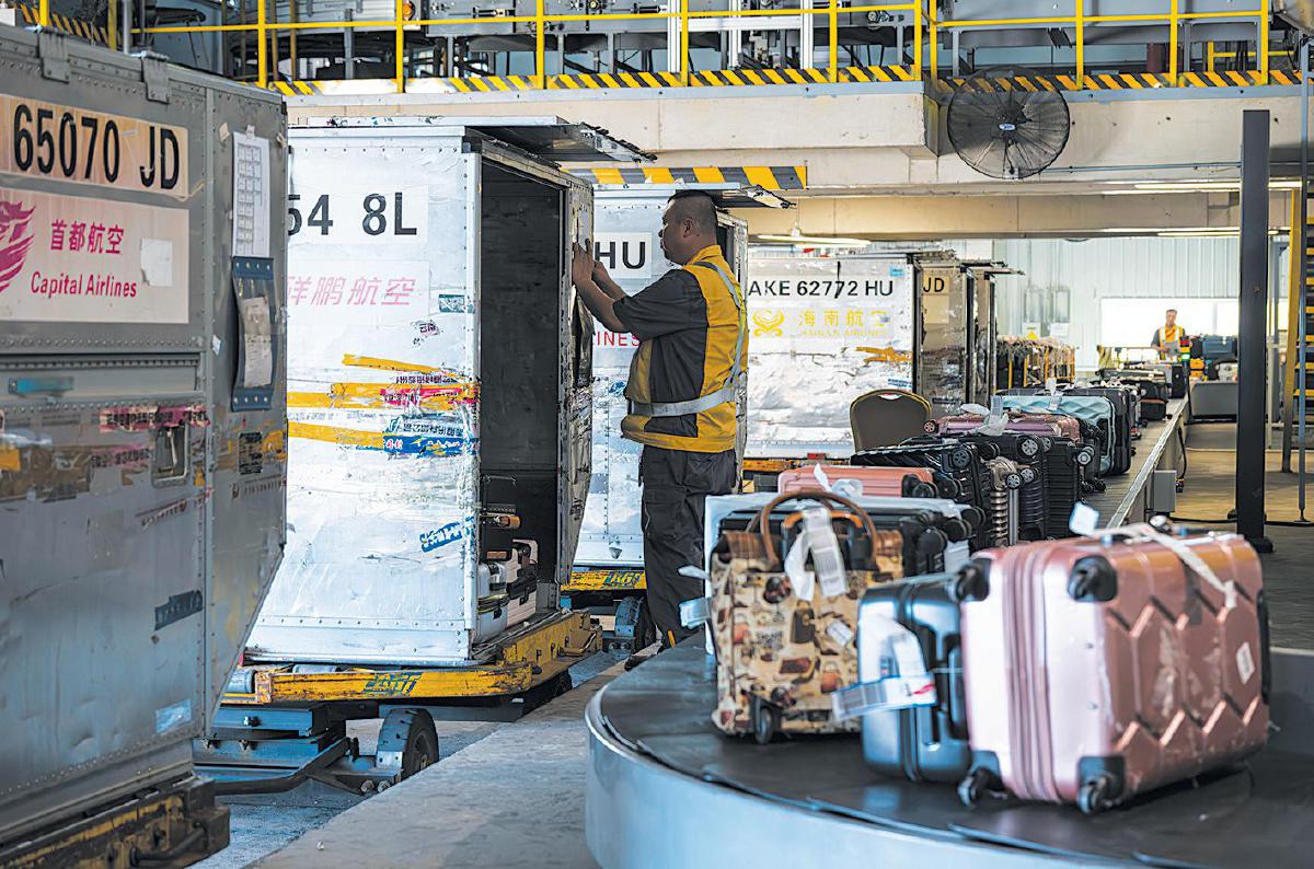 14时至20时及22时至次日2时航班进港高峰,行李传送带再次高速运转。“我们得快,但手上还得稳,不能让旅客等。”为了让旅客尽快提取行李,分拣员们在保证轻拿轻放的前提下争分夺秒。即使是午夜也闷热难挡,额头布满汗珠,又顺着鬓角流下,大伙儿用手一抹,接着忙碌。