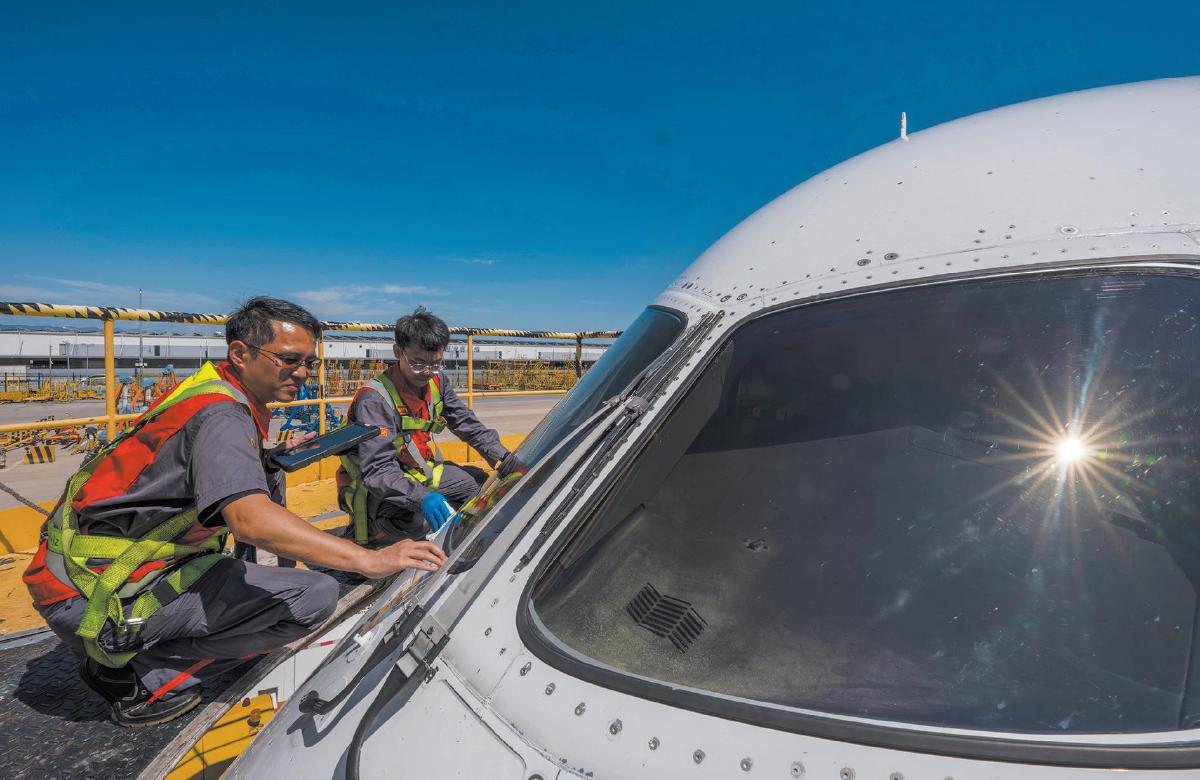 7月17日,首都机场,烈日下,机务人员对飞机风挡玻璃进行维护。 本版摄影/新京报记者 陶冉