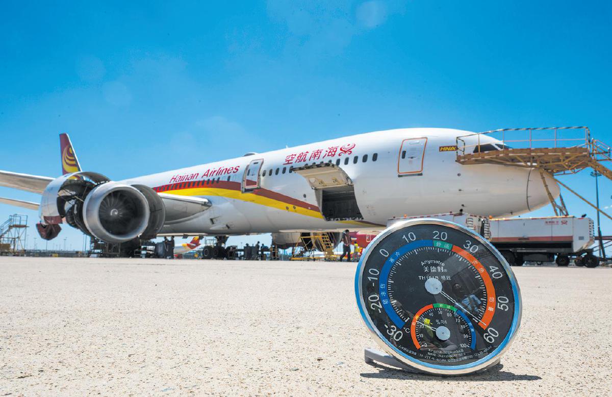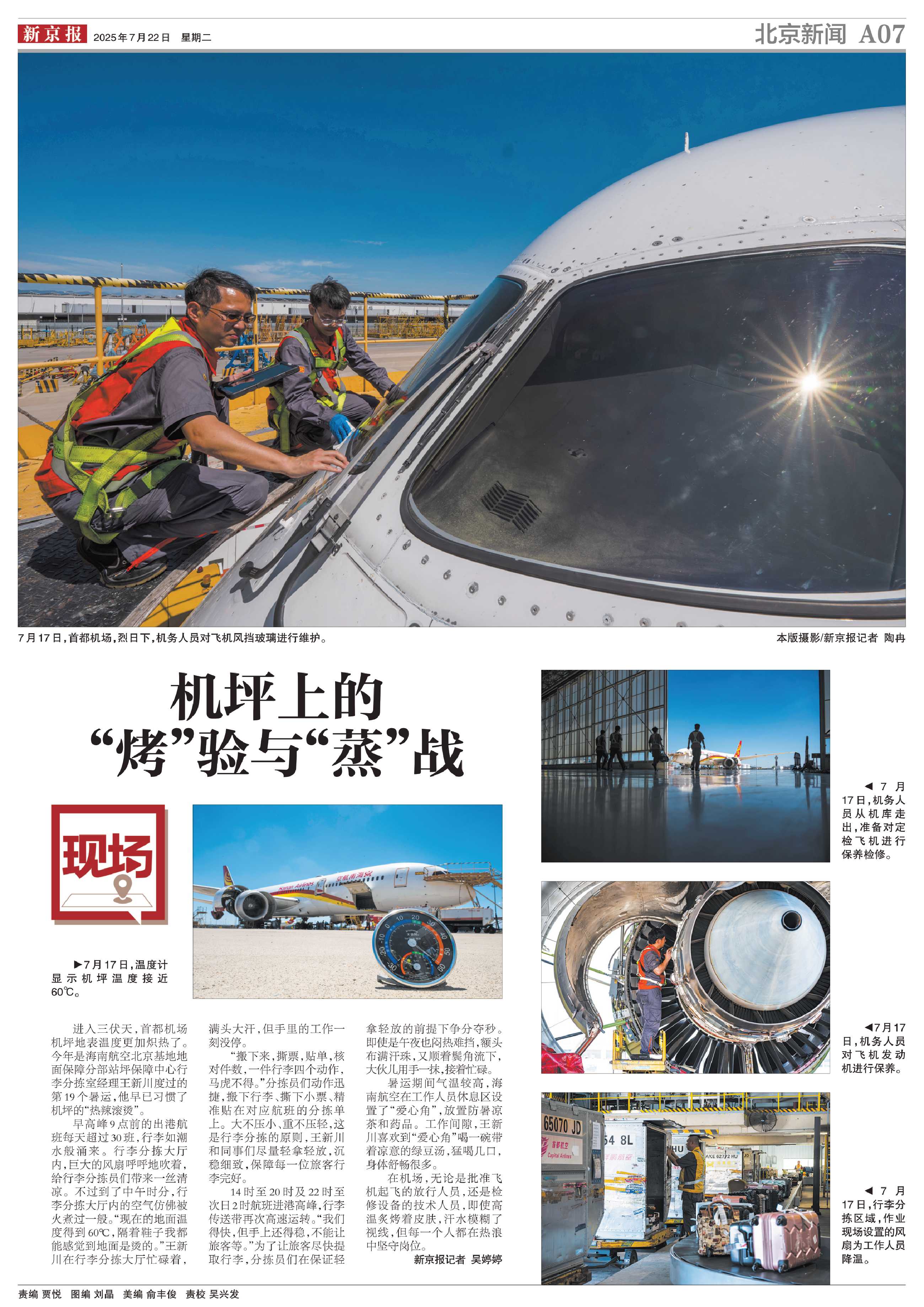 在机场,无论是批准飞机起飞的放行人员,还是检修设备的技术人员,即使高温炙烤着皮肤,汗水模糊了视线,但每一个人都在热浪中坚守岗位。新京报记者 吴婷婷