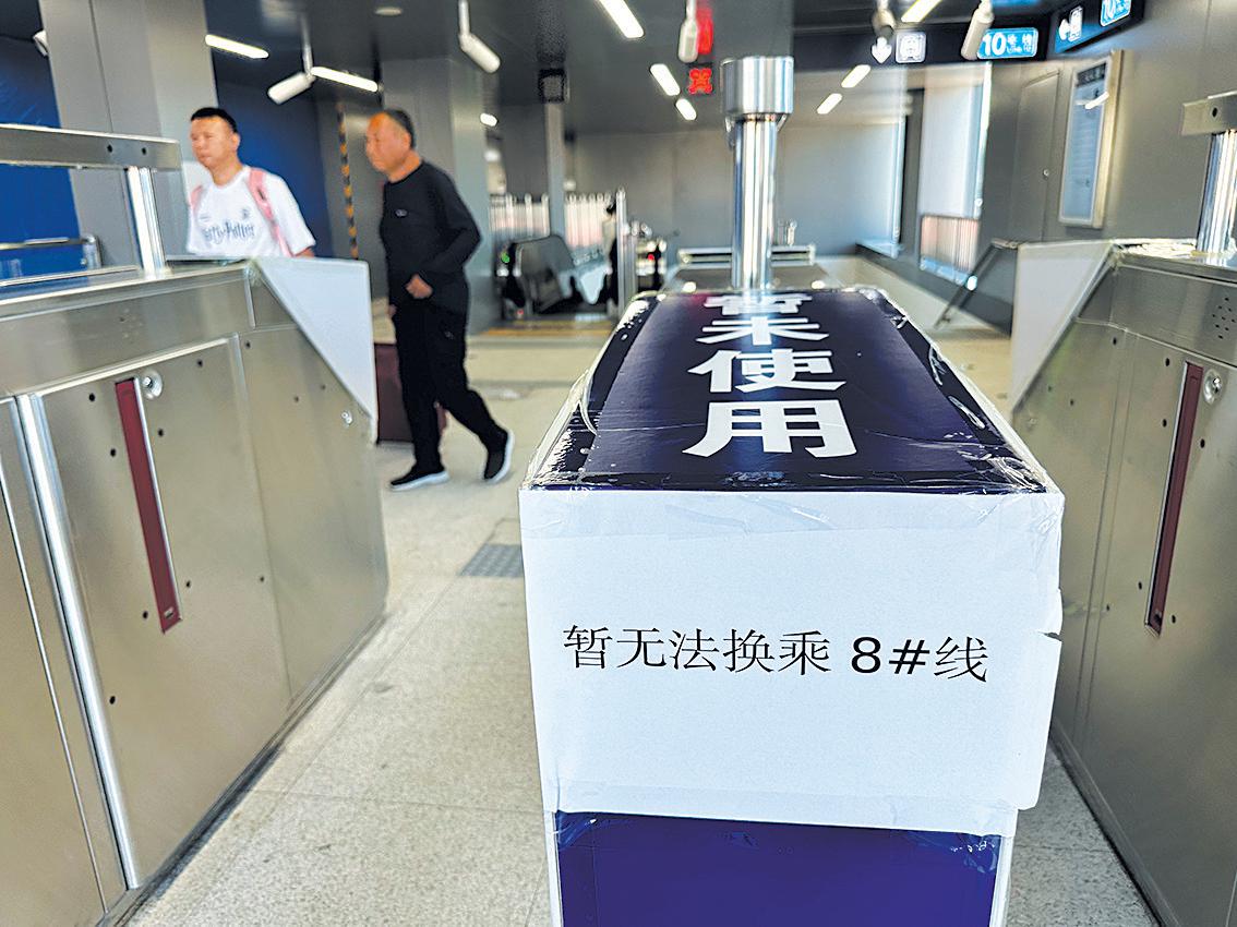 地铁大红门站C口处新加装的多台检票闸机上贴有“暂无法换乘8号线”提示。