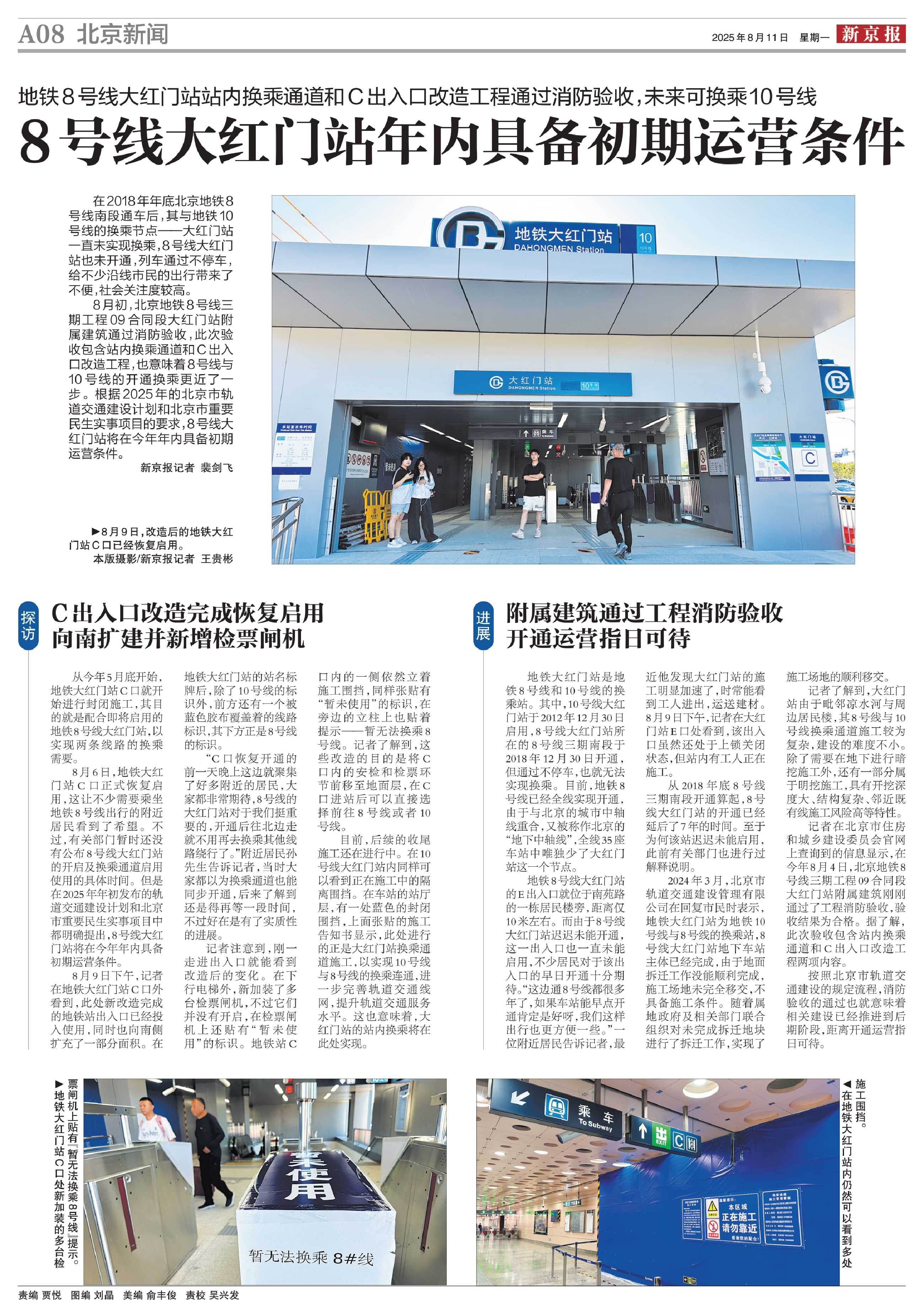 8月初,北京地铁8号线三期工程09合同段大红门站附属建筑通过消防验收,此次验收包含站内换乘通道和C出入口改造工程,也意味着8号线与10号线的开通换乘更近了一步。根据2025年的北京市轨道交通建设计划和北京市重要民生实事项目的要求,8号线大红门站将在今年年内具备初期运营条件。新京报记者 裴剑飞
