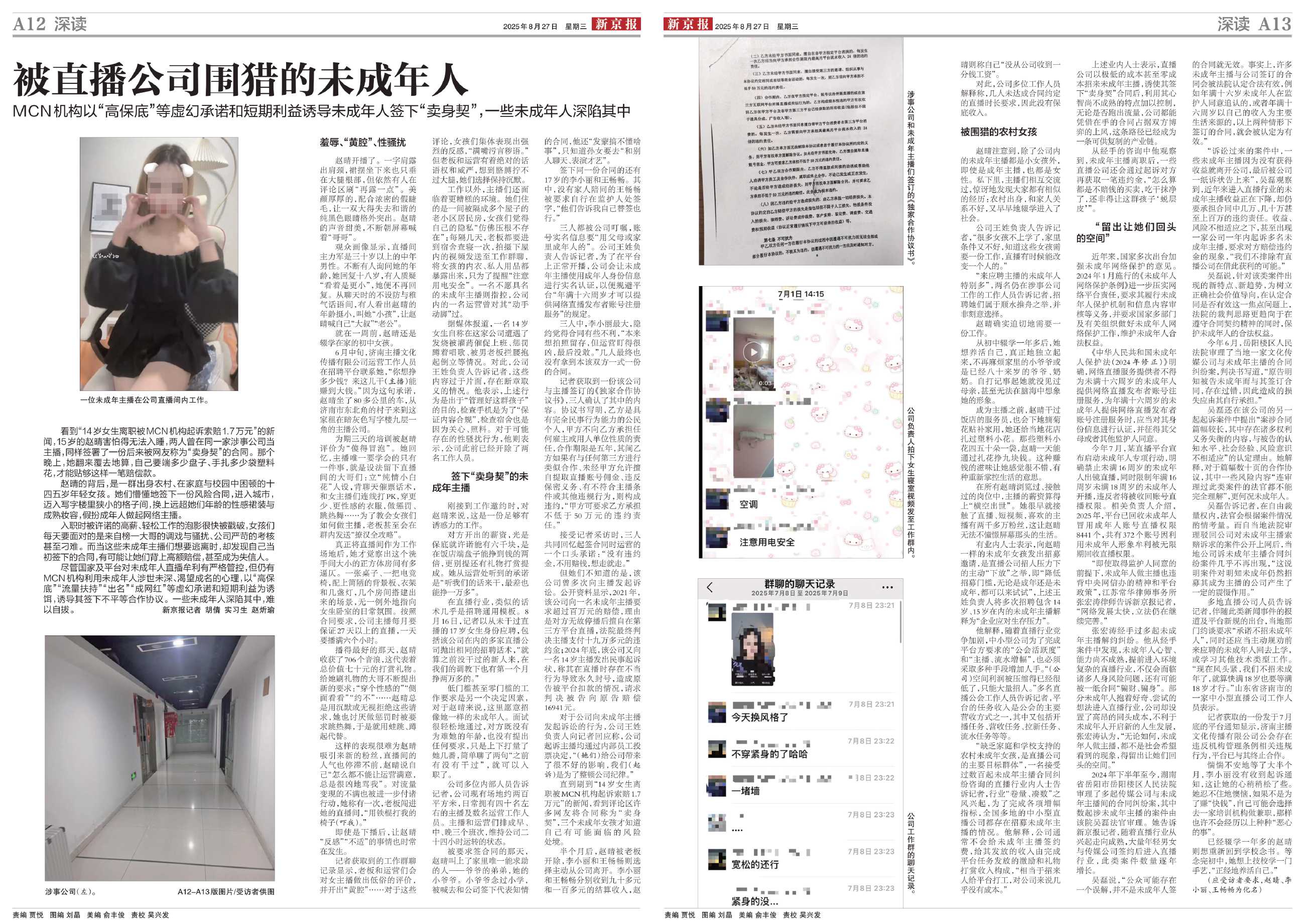 尽管国家及平台对未成年人直播牟利有严格管控,但仍有MCN机构利用未成年人涉世未深、渴望成名的心理,以“高保底”“流量扶持”“出名”“成网红”等虚幻承诺和短期利益为诱饵,诱导其签下不平等合作协议。一些未成年人深陷其中,难以自拔。 新京报记者 胡倩 实习生 赵炘瑜