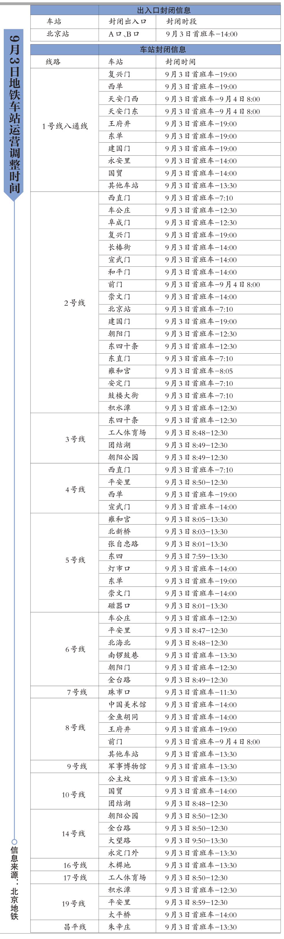9月3日首班车起至19:00(继续封闭车站除外),地铁1号线八通线、2号线、3号线、4号线、5号线、6号线、7号线、8号线、9号线、10号线、14号线、16号线、17号线、19号线、昌平线部分车站、出入口分时段封闭。