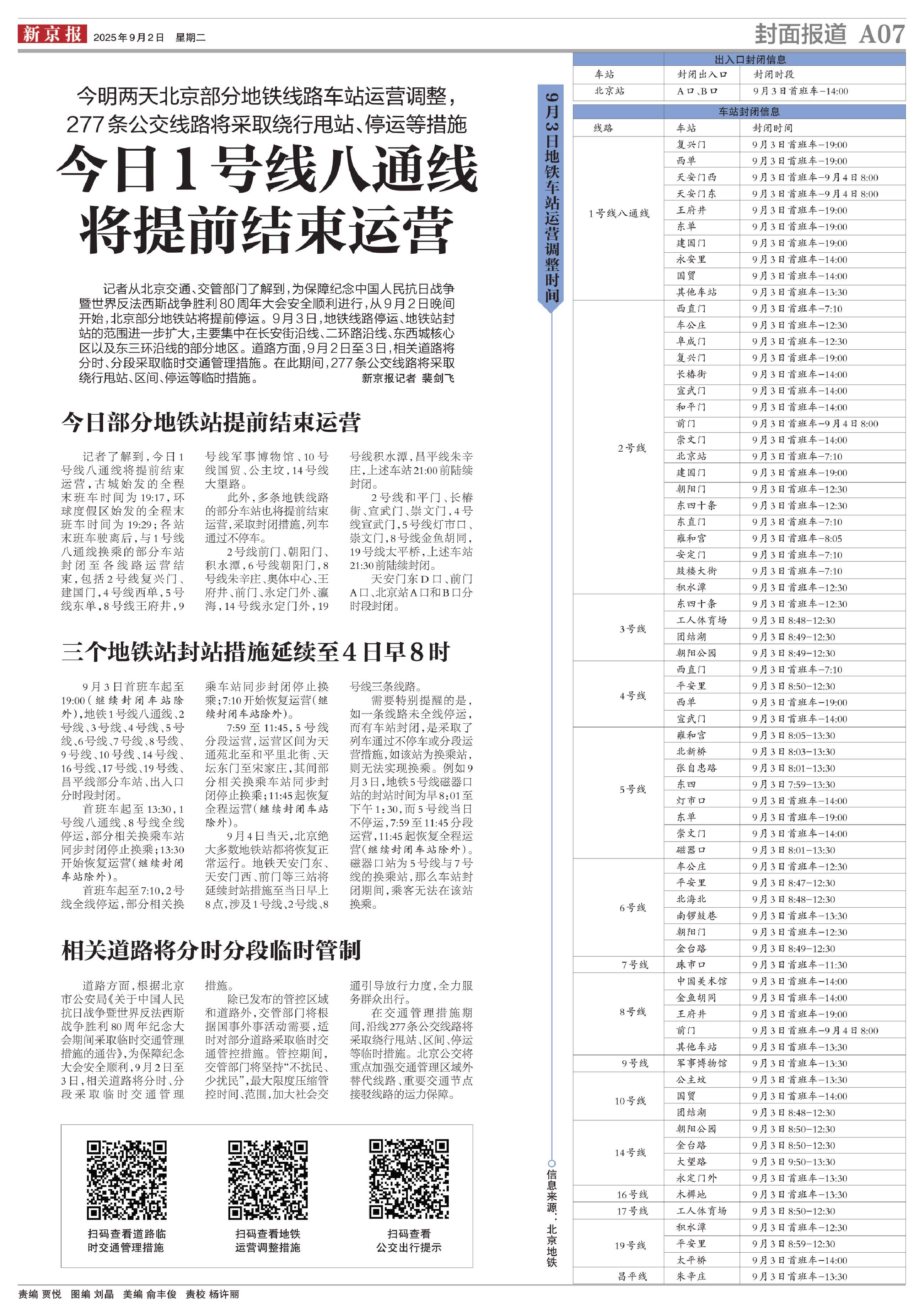 记者从北京交通、交管部门了解到,为保障纪念中国人民抗日战争暨世界反法西斯战争胜利80周年大会安全顺利进行,从9月2日晚间开始,北京部分地铁站将提前停运。9月3日,地铁线路停运、地铁站封站的范围进一步扩大,主要集中在长安街沿线、二环路沿线、东西城核心区以及东三环沿线的部分地区。道路方面,9月2日至3日,相关道路将分时、分段采取临时交通管理措施。在此期间,277条公交线路将采取绕行甩站、区间、停运等临时措施。 新京报记者 裴剑飞