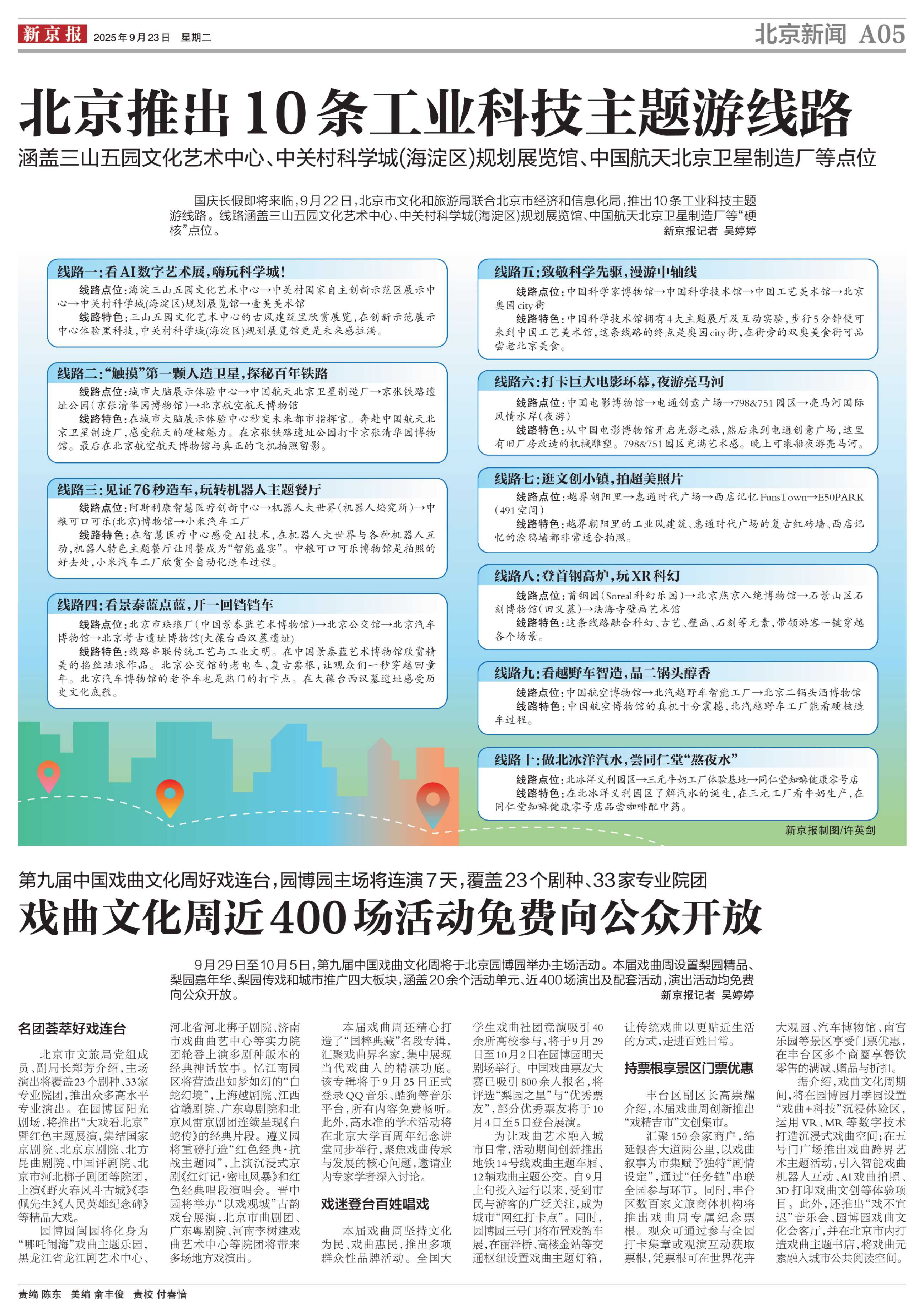 国庆长假即将来临,9月22日,北京市文化和旅游局联合北京市经济和信息化局,推出10条工业科技主题游线路。线路涵盖三山五园文化艺术中心、中关村科学城(海淀区)规划展览馆、中国航天北京卫星制造厂等“硬核”点位。 新京报记者 吴婷婷