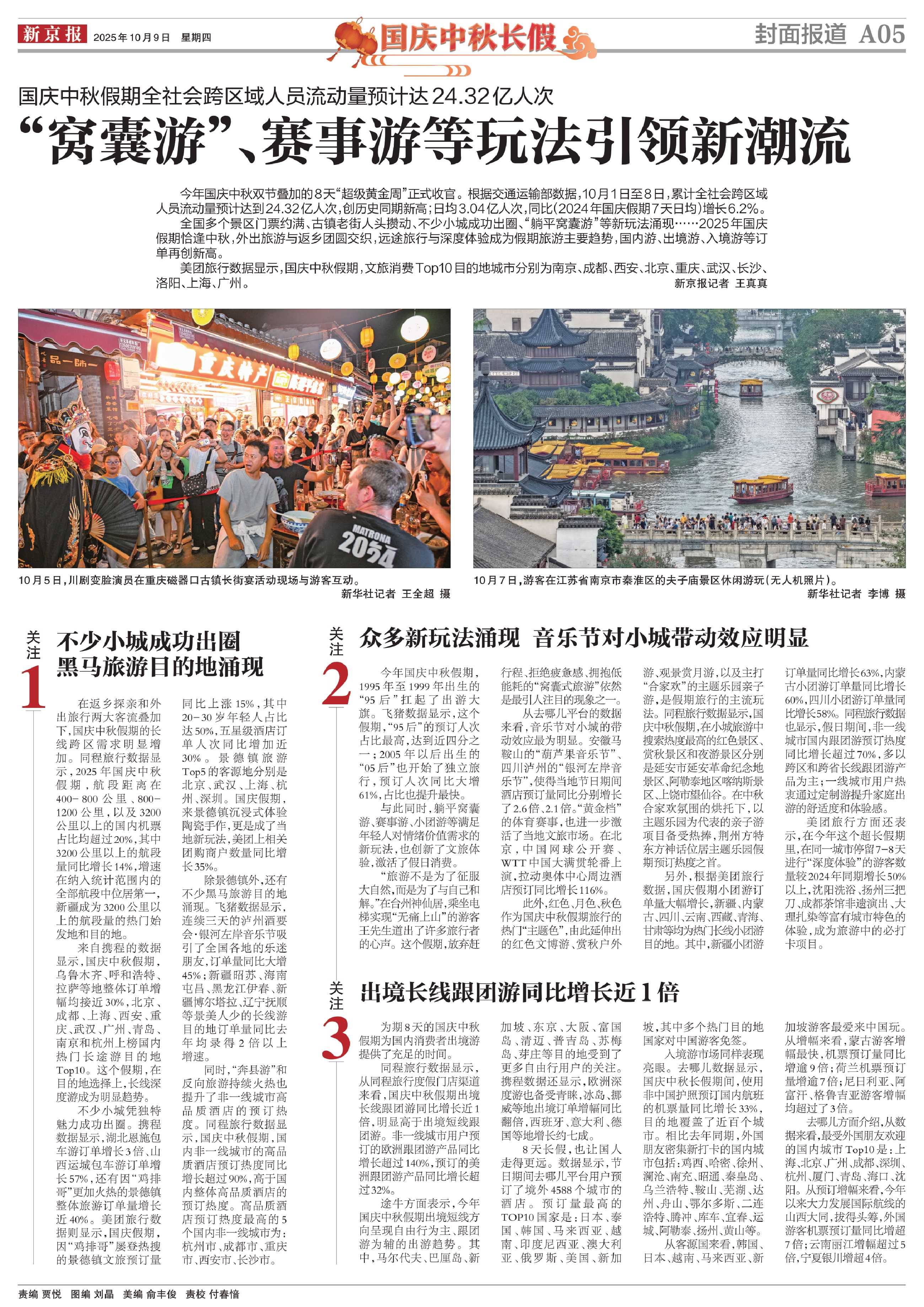 全国多个景区门票约满、古镇老街人头攒动、不少小城成功出圈、“躺平窝囊游”等新玩法涌现……2025年国庆假期恰逢中秋,外出旅游与返乡团圆交织,远途旅行与深度体验成为假期旅游主要趋势,国内游、出境游、入境游等订单再创新高。