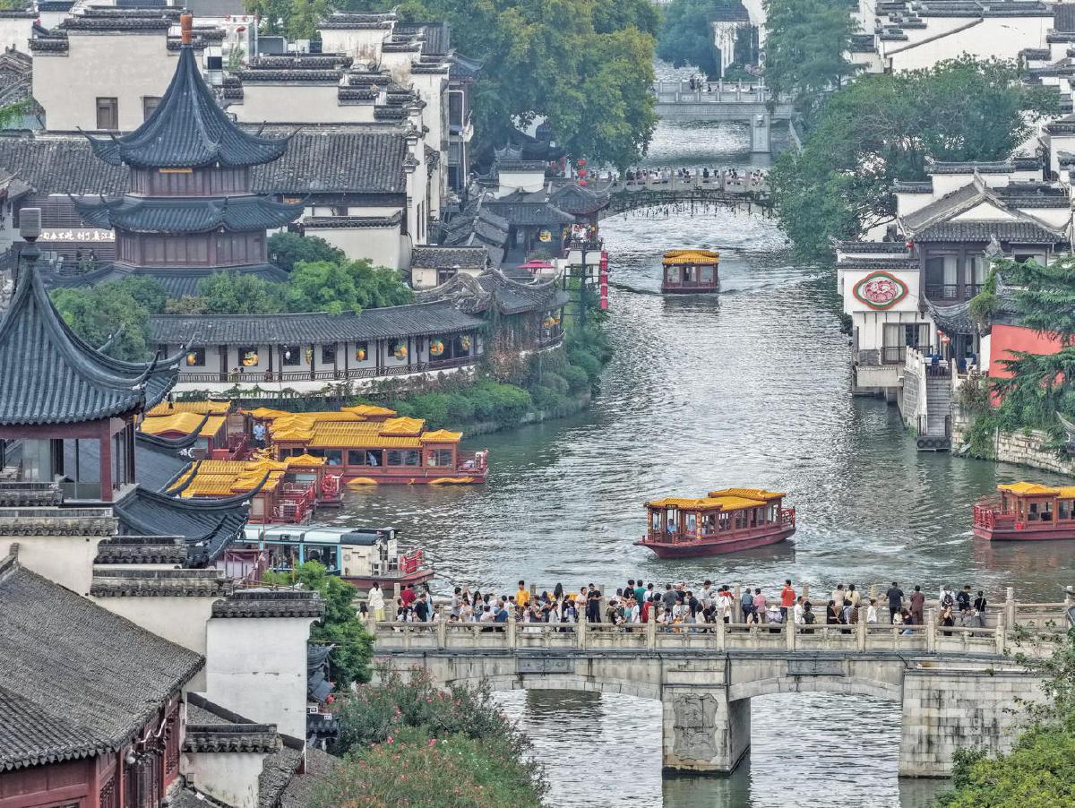10月7日,游客在江苏省南京市秦淮区的夫子庙景区休闲游玩(无人机照片)。 新华社记者 李博 摄