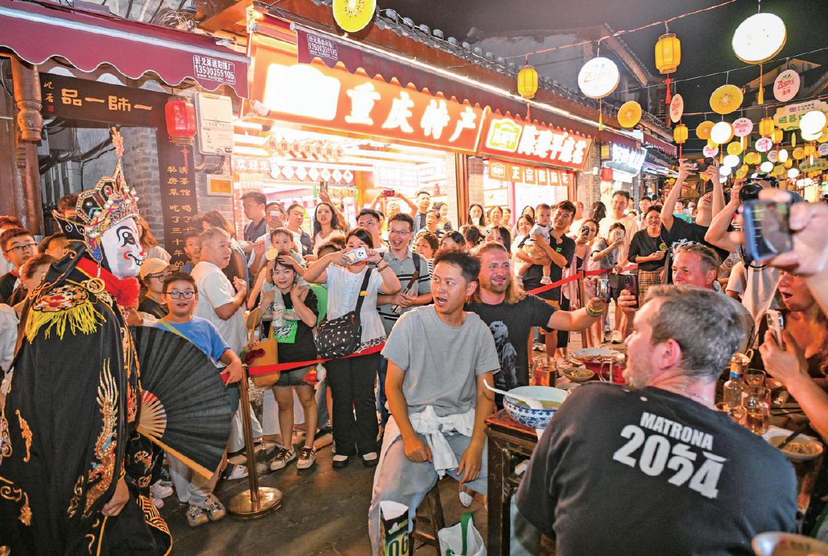 10月5日,川剧变脸演员在重庆磁器口古镇长街宴活动现场与游客互动。 新华社记者 王全超 摄