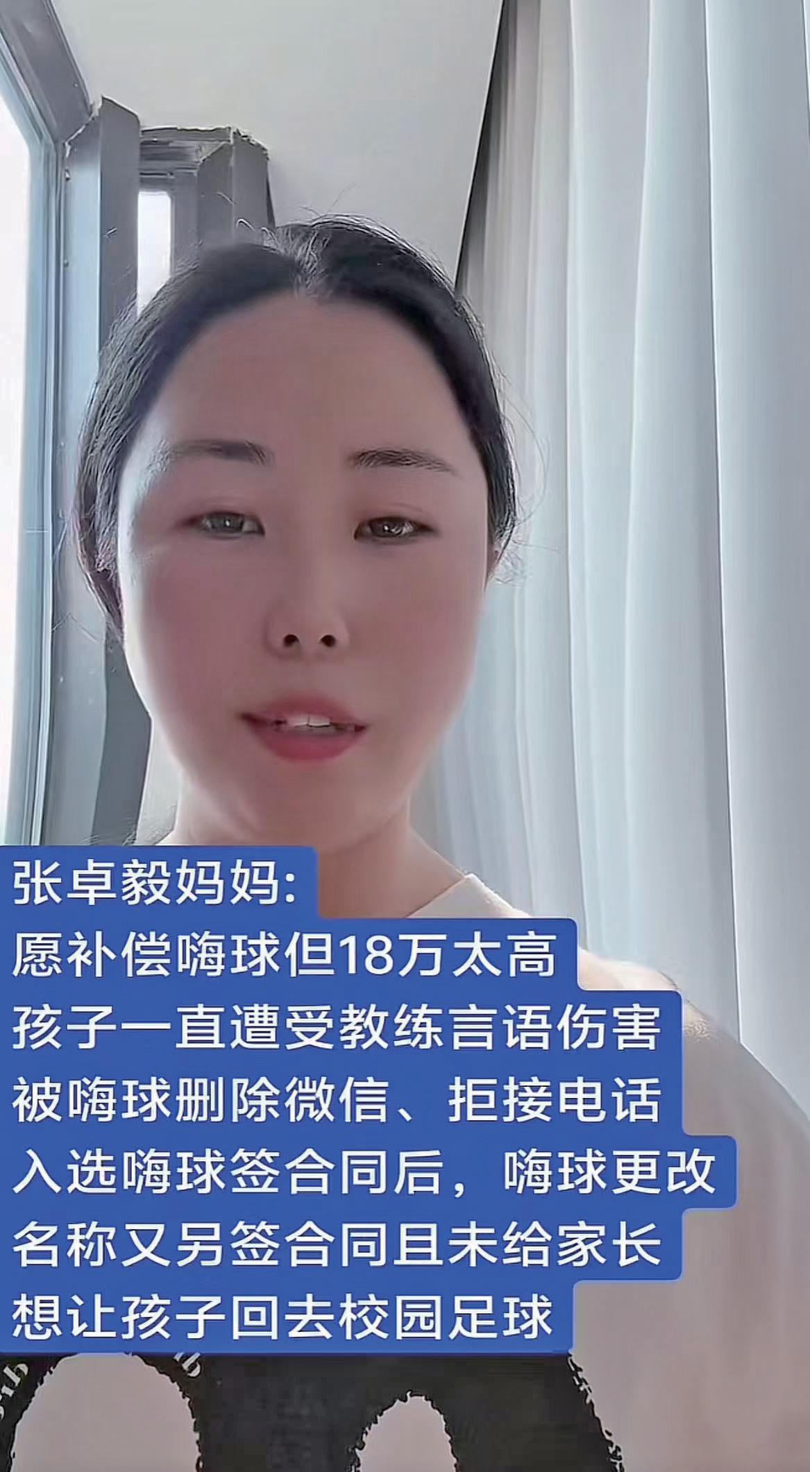 视频中,周亚男概述张卓毅与教练组难以磨合,且与嗨球沟通解约未果。她强调,“愿意付合理违约金,但不是天价18万。”还表示,“18万元违约金既不合理又不合法,我们自己的孩子,我们有权利选择其他俱乐部或回归校园足球”。