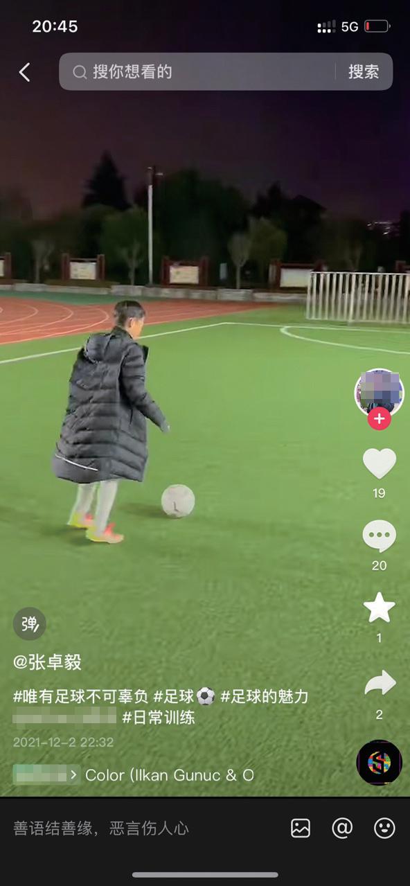 2021年,张卓毅在球场练习射门。 张卓毅社交账号视频截图