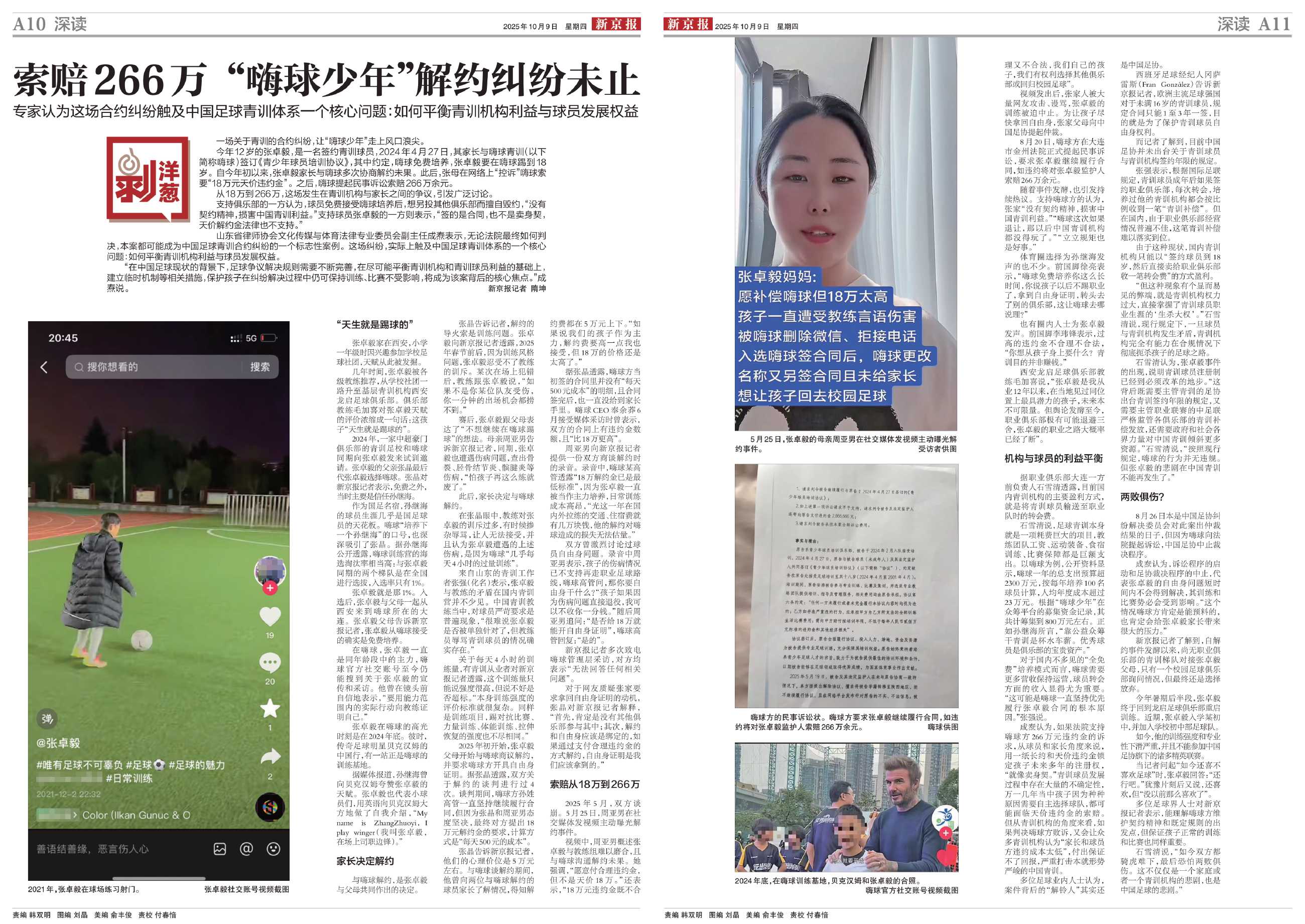 今年12岁的张卓毅,是一名签约青训球员,2024年4月27日,其家长与嗨球青训(以下简称嗨球)签订《青少年球员培训协议》,其中约定,嗨球免费培养,张卓毅要在嗨球踢到18岁。自今年初以来,张卓毅家长与嗨球多次协商解约未果。此后,张母在网络上“控诉”嗨球索要“18万元天价违约金”。之后,嗨球提起民事诉讼索赔266万余元。