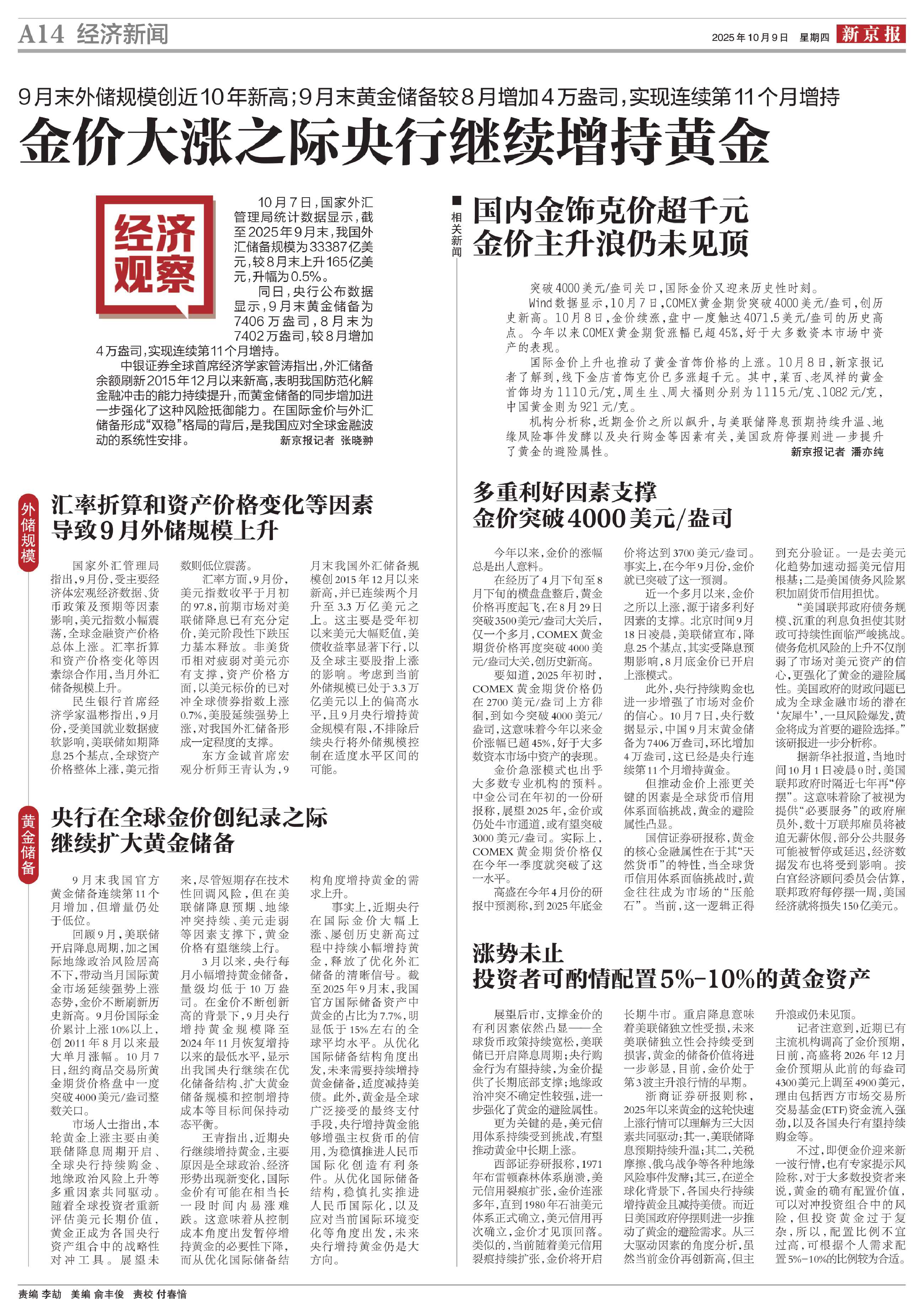 机构分析称,近期金价之所以飙升,与美联储降息预期持续升温、地缘风险事件发酵以及央行购金等因素有关,美国政府停摆则进一步提升了黄金的避险属性。 新京报记者 潘亦纯