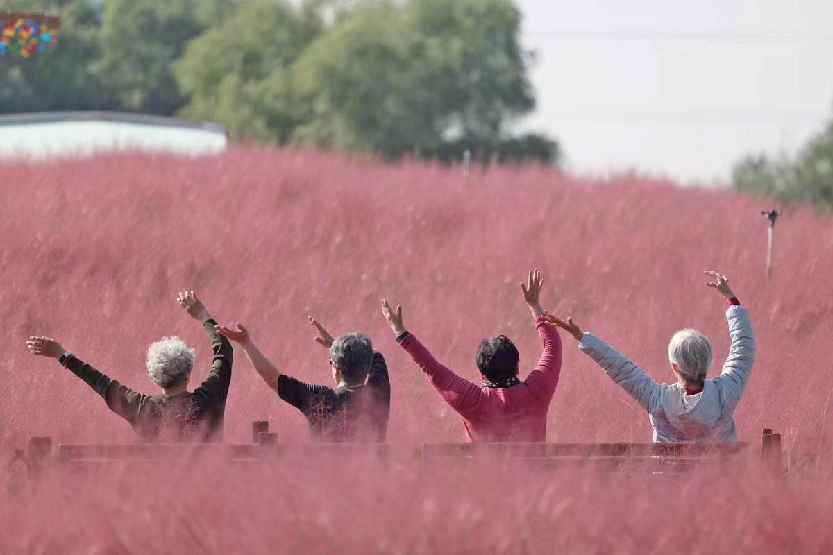 场景:市民坐在盛开的粉黛草前拍照打卡。