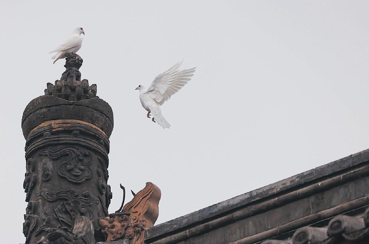 场景:一只鸽子站在牌楼上,另一只鸽子从远处飞来。 新京报记者李木易 摄