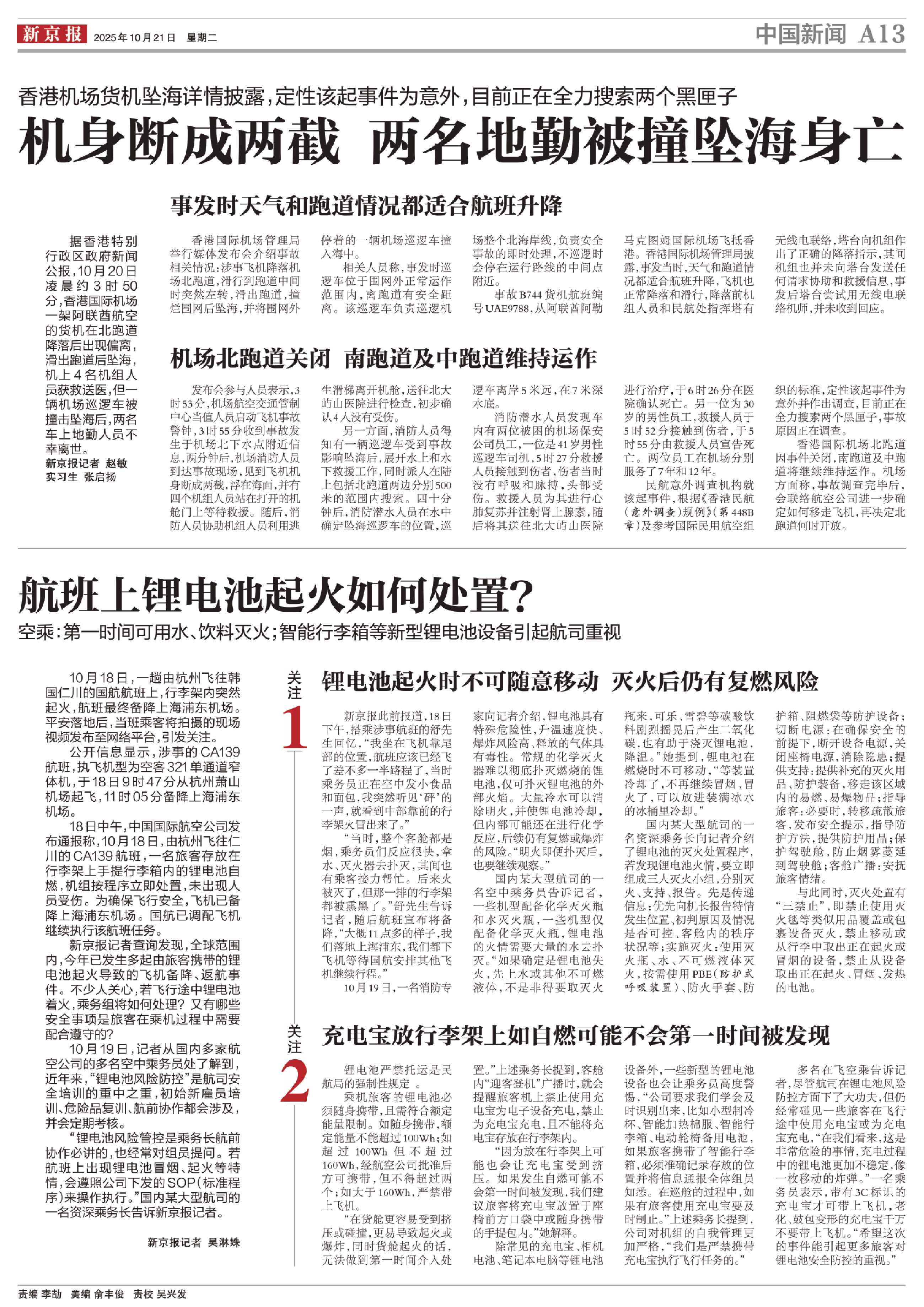 “锂电池风险管控是乘务长航前协作必讲的,也经常对组员提问。若航班上出现锂电池冒烟、起火等特情,会遵照公司下发的SOP(标准程序)来操作执行。”国内某大型航司的一名资深乘务长告诉新京报记者。 新京报记者 吴淋姝