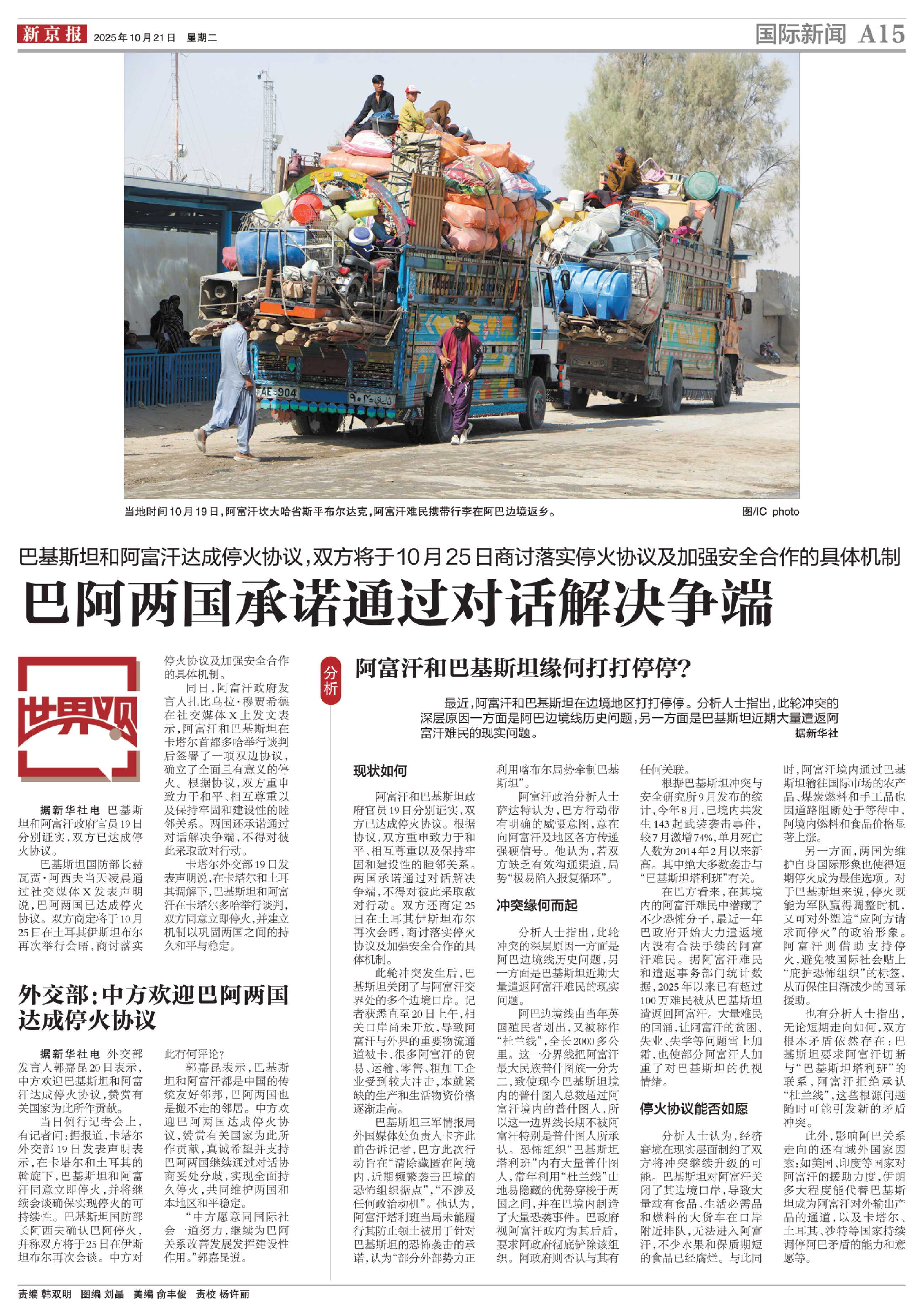 巴基斯坦国防部长赫瓦贾·阿西夫当天凌晨通过社交媒体X发表声明说,巴阿两国已达成停火协议。双方商定将于10月25日在土耳其伊斯坦布尔再次举行会晤,商讨落实停火协议及加强安全合作的具体机制。