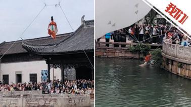 10月19日,浙江省嘉兴市桐乡市乌镇西栅景区一女演员表演时险落水,女演员被气球及威亚吊在半空中,气球随风摆动后突然飘向一边,多人合力拉住安全绳,将女演员拉回平台后安全放下。所幸演员没有受伤。