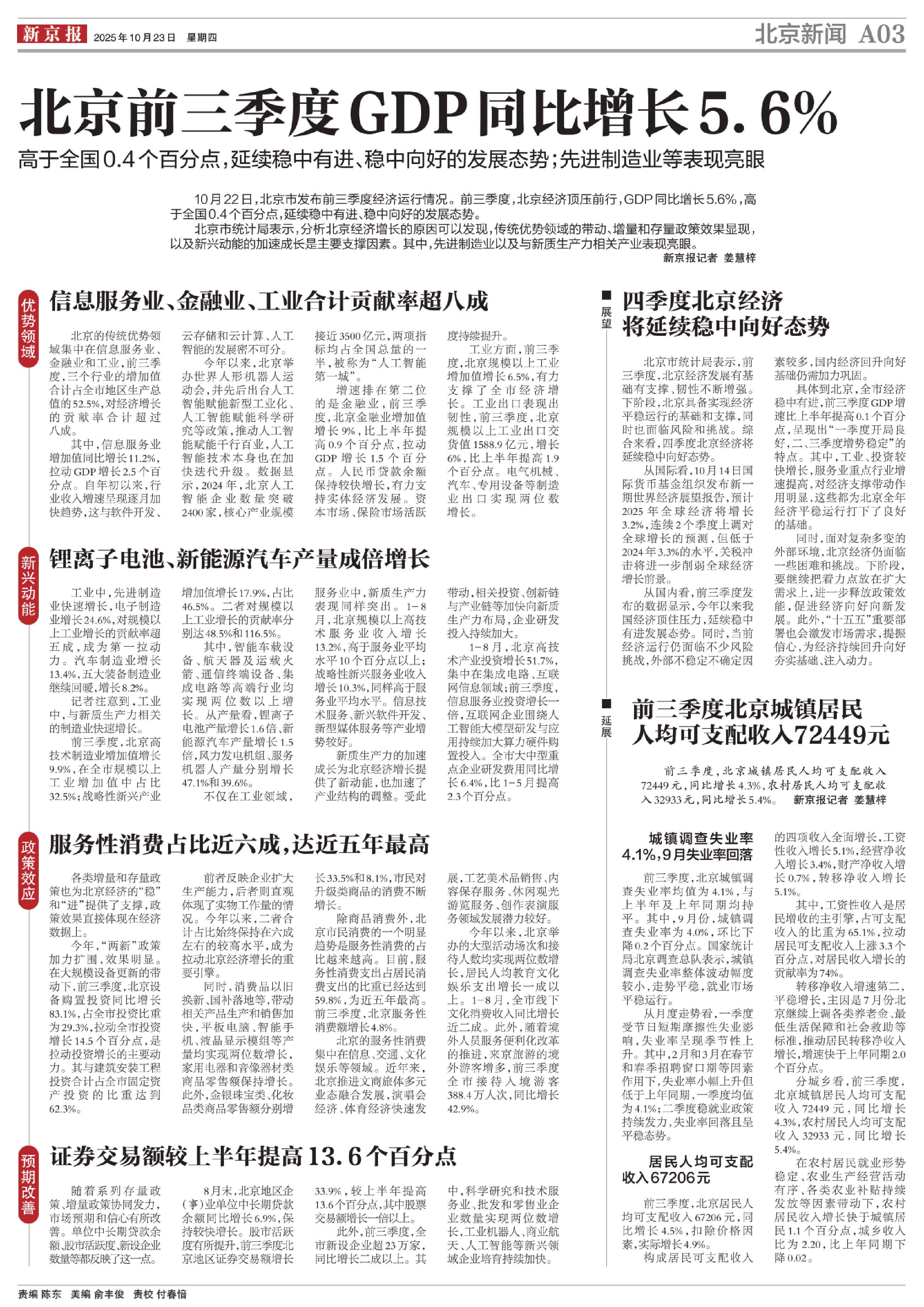 10月22日,北京市发布前三季度经济运行情况。前三季度,北京经济顶压前行,GDP同比增长5.6%,高于全国0.4个百分点,延续稳中有进、稳中向好的发展态势。
