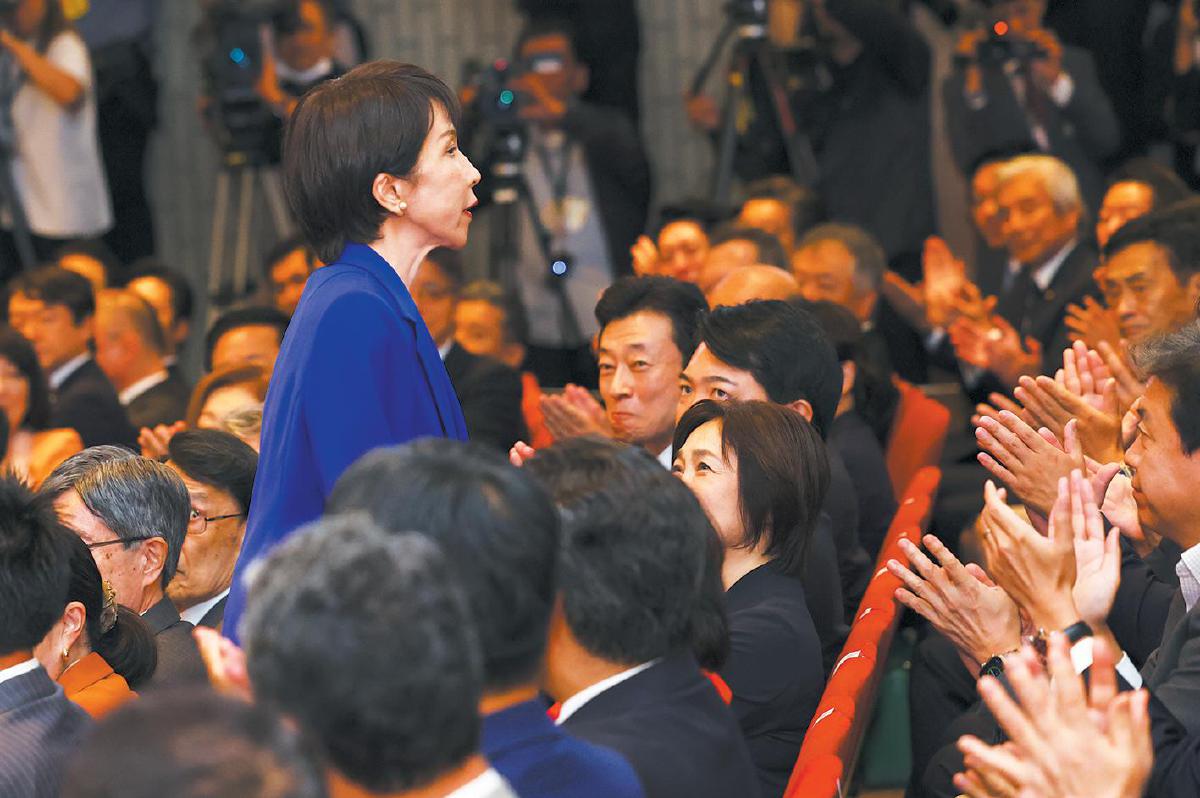 10月4日,在东京自民党总部,高市早苗在自民党总裁选举现场。 新华社发(Pool图片,金敬勋 摄)