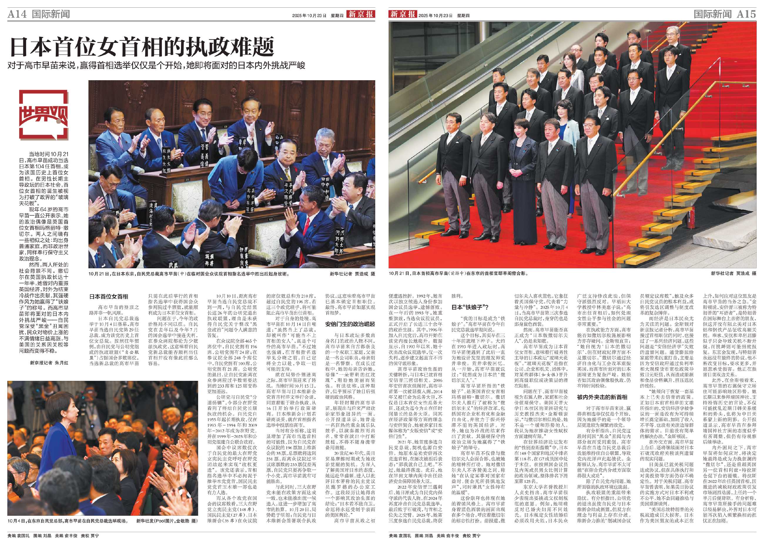 然而,两人所处的社会背景不同。撒切尔在英国执政长达十一年半,她曾对内重振英国经济,对外为结束冷战作出贡献,其强硬作风为她赢得了“铁娘子”的称号。而高市早苗即将面对的日本内外挑战严峻——自民党深受“黑金”丑闻困扰,民众对物价上涨的不满情绪日益高涨,与美国的关系因关税等问题而变得不稳。 新京报记者 朱月红