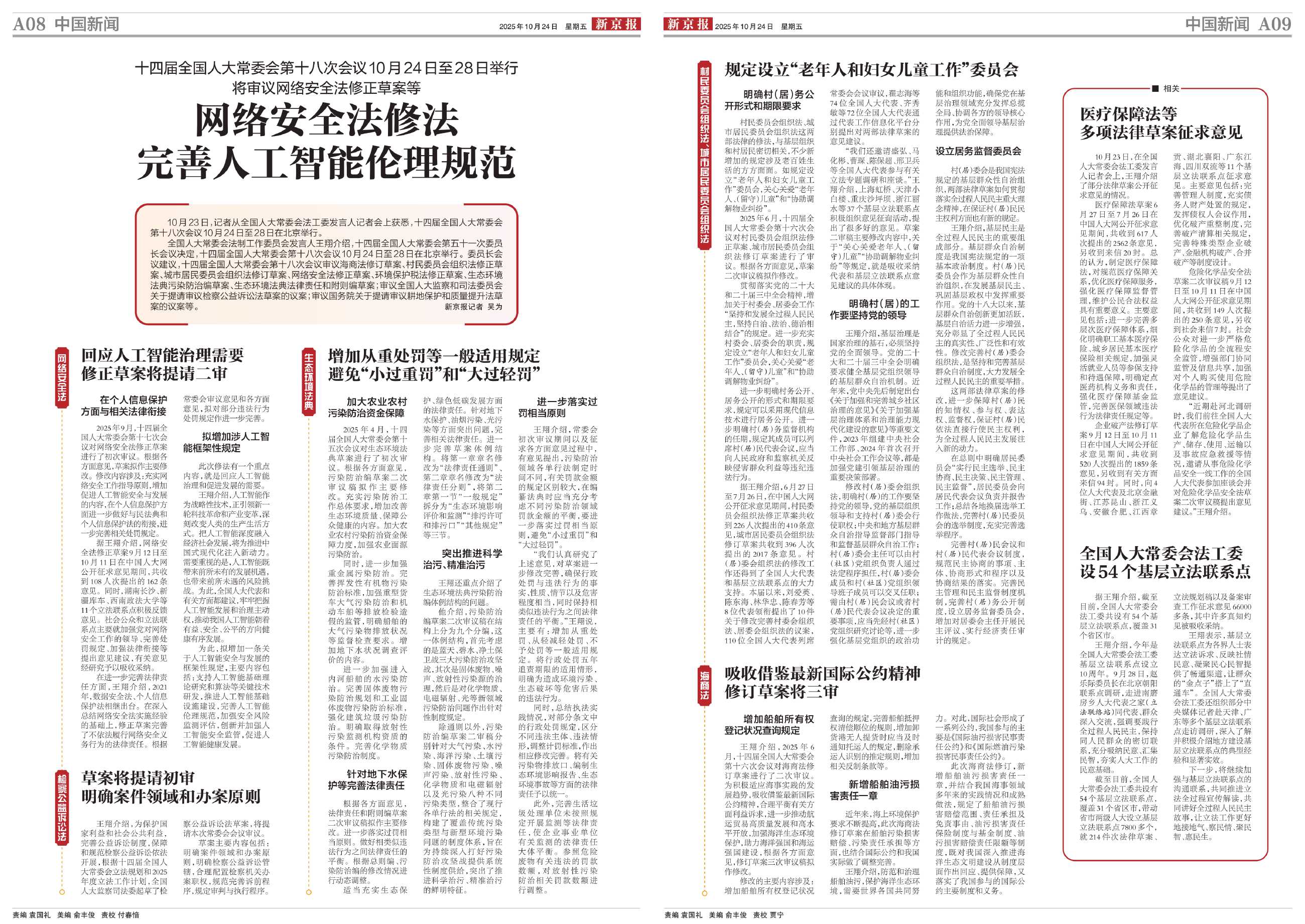 全国人大常委会法制工作委员会发言人王翔介绍,十四届全国人大常委会第五十一次委员长会议决定,十四届全国人大常委会第十八次会议10月24日至28日在北京举行。委员长会议建议,十四届全国人大常委会第十八次会议审议海商法修订草案、村民委员会组织法修正草案、城市居民委员会组织法修订草案、网络安全法修正草案、环境保护税法修正草案、生态环境法典污染防治编草案、生态环境法典法律责任和附则编草案;审议全国人大监察和司法委员会关于提请审议检察公益诉讼法草案的议案;审议国务院关于提请审议耕地保护和质量提升法草案的议案等。 新京报记者 吴为