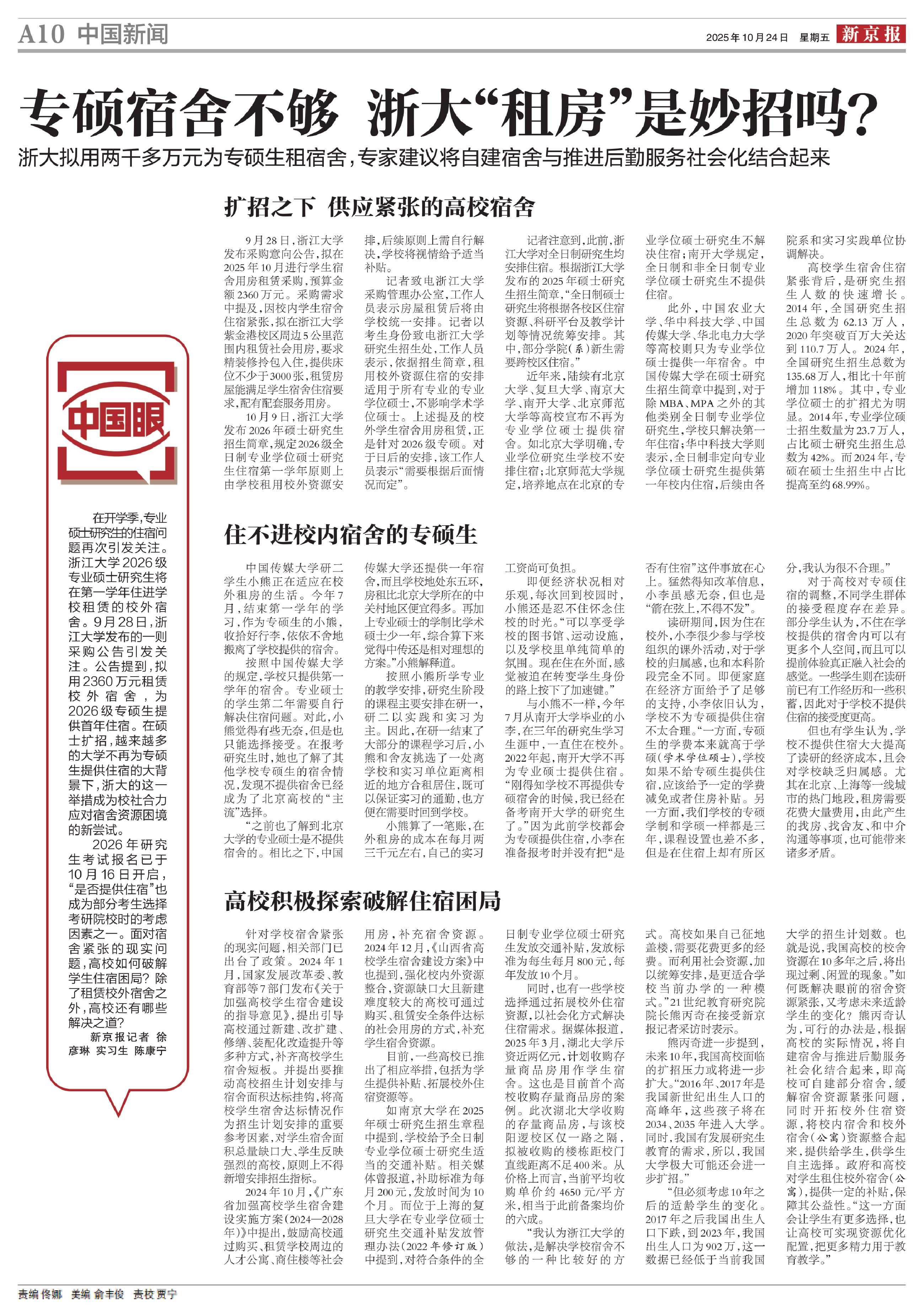 “我认为浙江大学的做法,是解决学校宿舍不够的一种比较好的方式。高校如果自己征地盖楼,需要花费更多的经费。而利用社会资源,加以统筹安排,是更适合学校当前办学的一种模式。”21世纪教育研究院院长熊丙奇在接受新京报记者采访时表示。