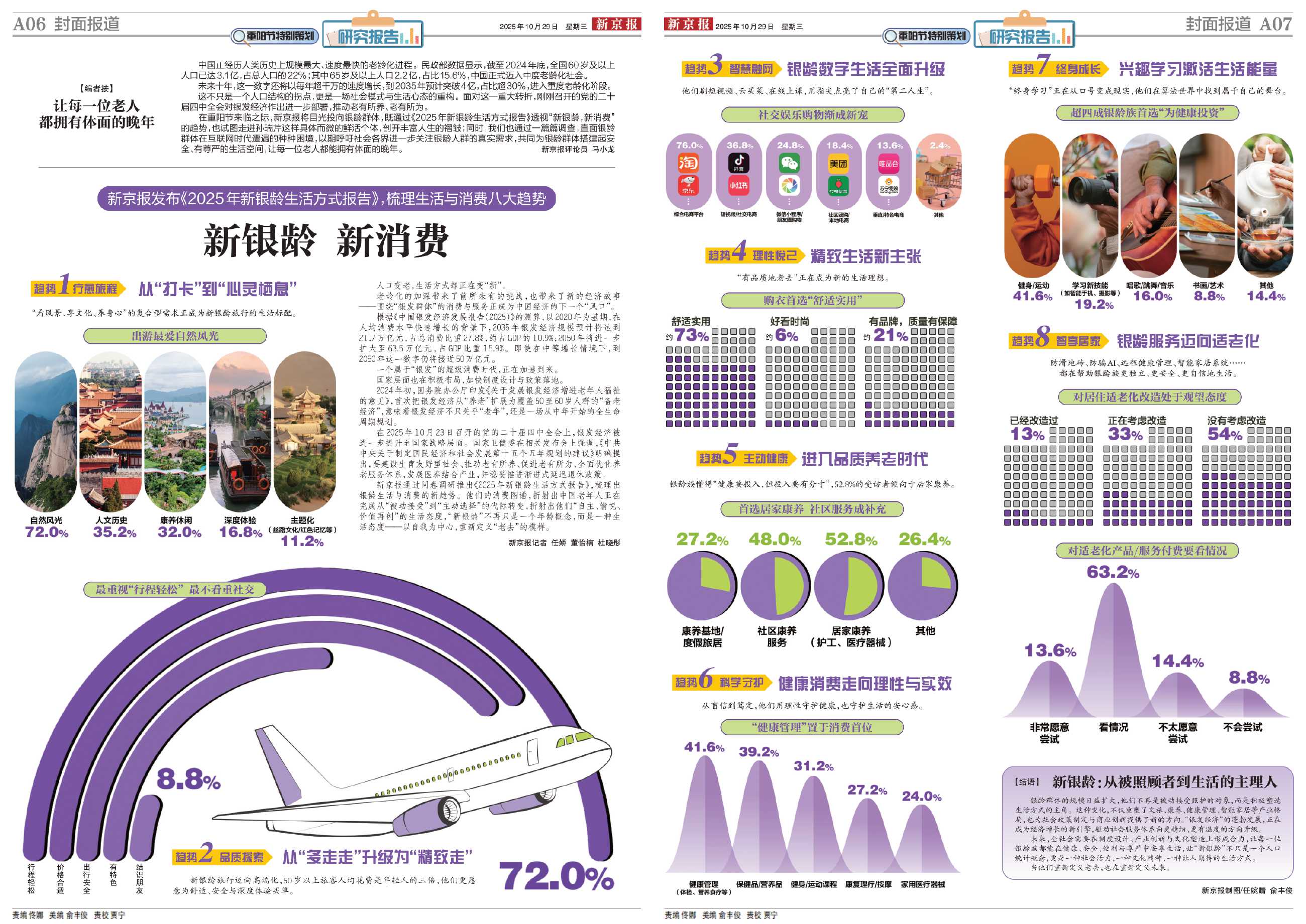 新京报通过问卷调研推出《2025年新银龄生活方式报告》,梳理出银龄生活与消费的新趋势。他们的消费图谱,折射出中国老年人正在完成从“被动接受”到“主动选择”的代际转变,折射出他们“自主、愉悦、价值再创”的生活态度,“新银龄”不再只是一个年龄概念,而是一种生活态度——以自我为中心,重新定义“老去”的模样。新京报记者 任娇 董怡楠 杜晓彤