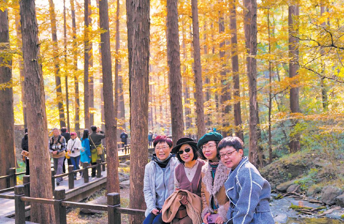 时间:10月28日地点:国家植物园场景:游客在水杉林拍照留念。新京报记者薛珺 摄