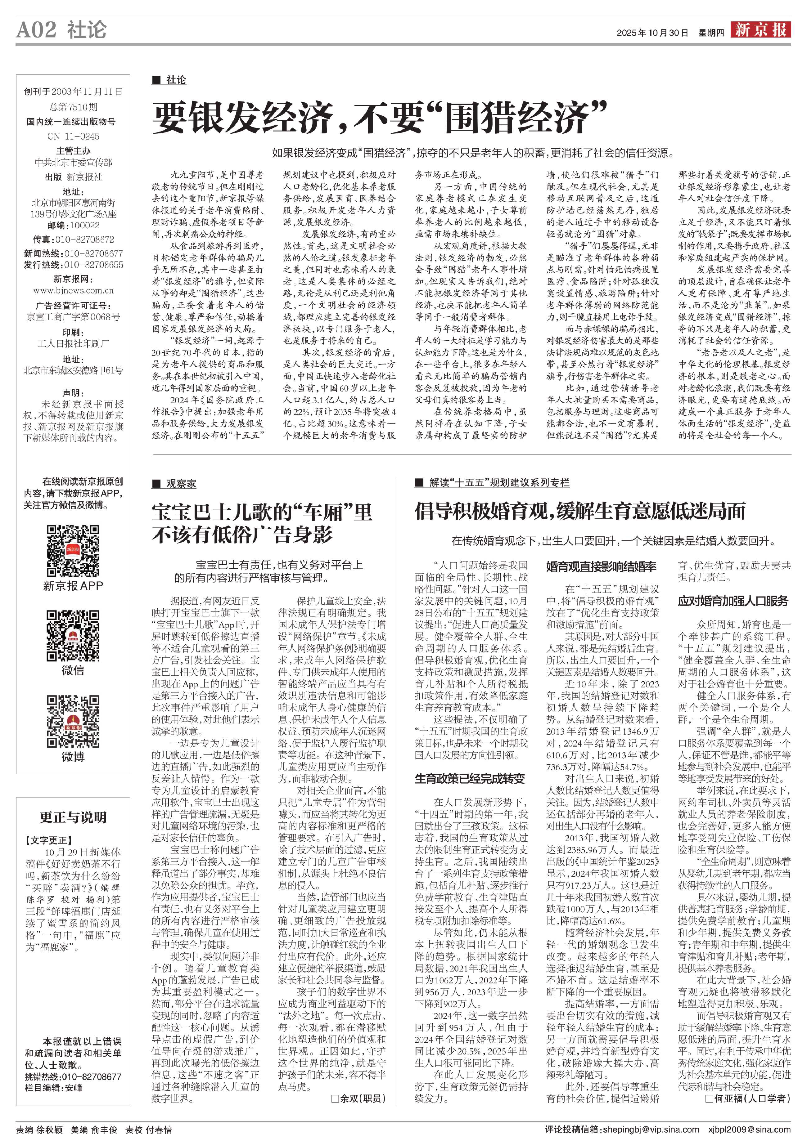 “人口问题始终是我国面临的全局性、长期性、战略性问题。”针对人口这一国家发展中的关键问题,10月28日公布的“十五五”规划建议提出:“促进人口高质量发展。健全覆盖全人群、全生命周期的人口服务体系。倡导积极婚育观,优化生育支持政策和激励措施,发挥育儿补贴和个人所得税抵扣政策作用,有效降低家庭生育养育教育成本。”