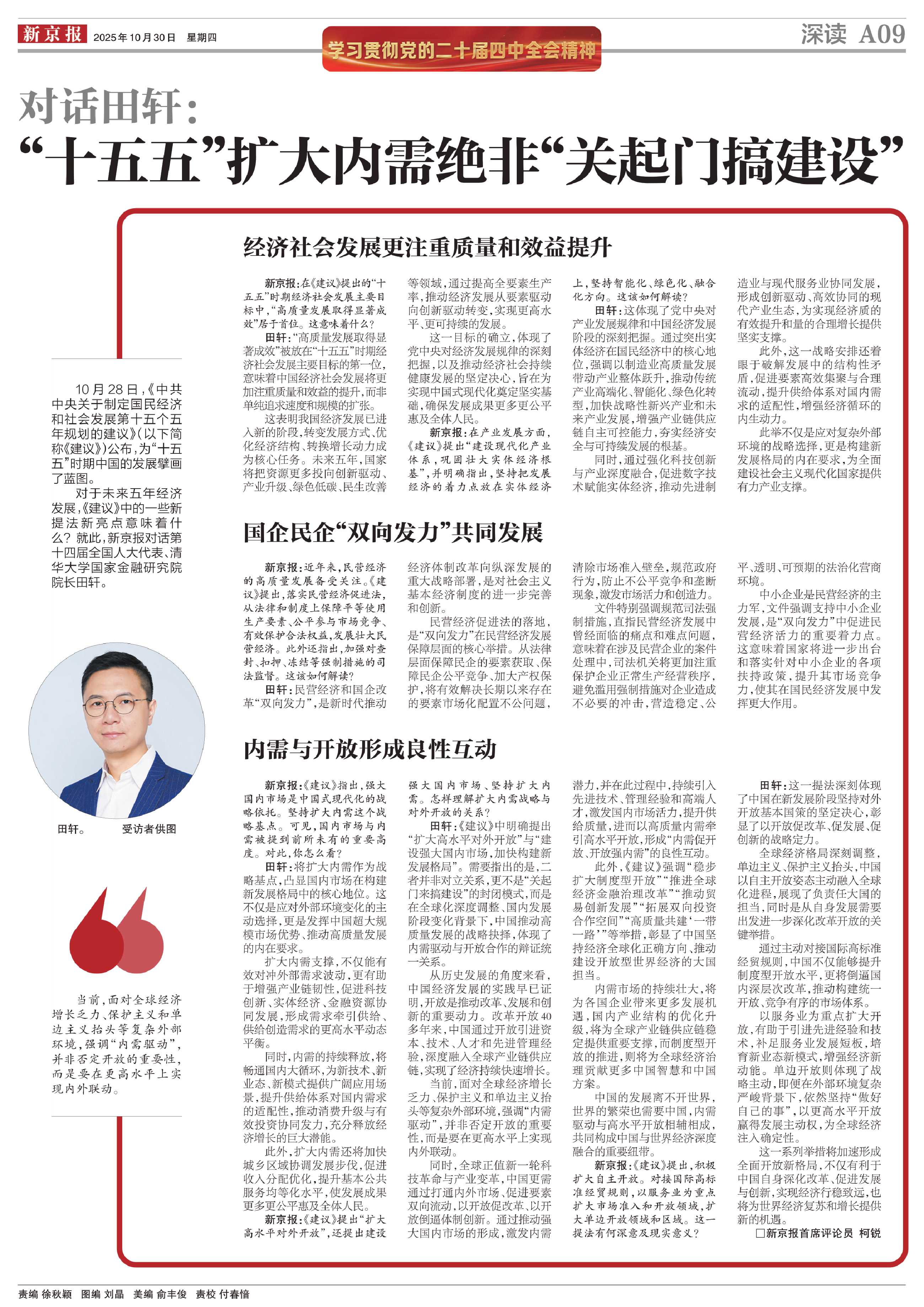 对于未来五年经济发展,《建议》中的一些新提法新亮点意味着什么?就此,新京报对话第十四届全国人大代表、清华大学国家金融研究院院长田轩。