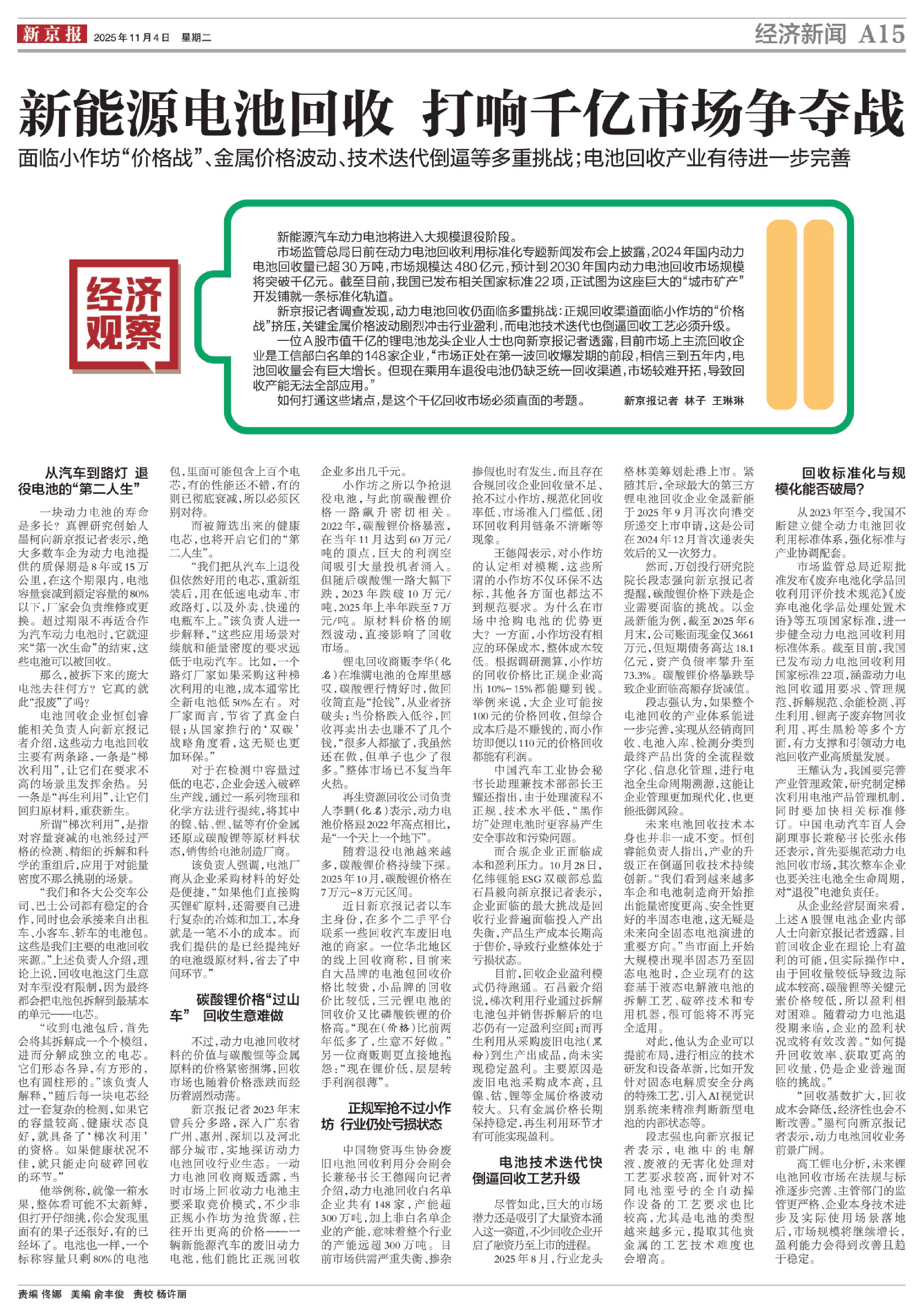 新京报记者调查发现,动力电池回收仍面临多重挑战:正规回收渠道面临小作坊的“价格战”挤压,关键金属价格波动剧烈冲击行业盈利,而电池技术迭代也倒逼回收工艺必须升级。