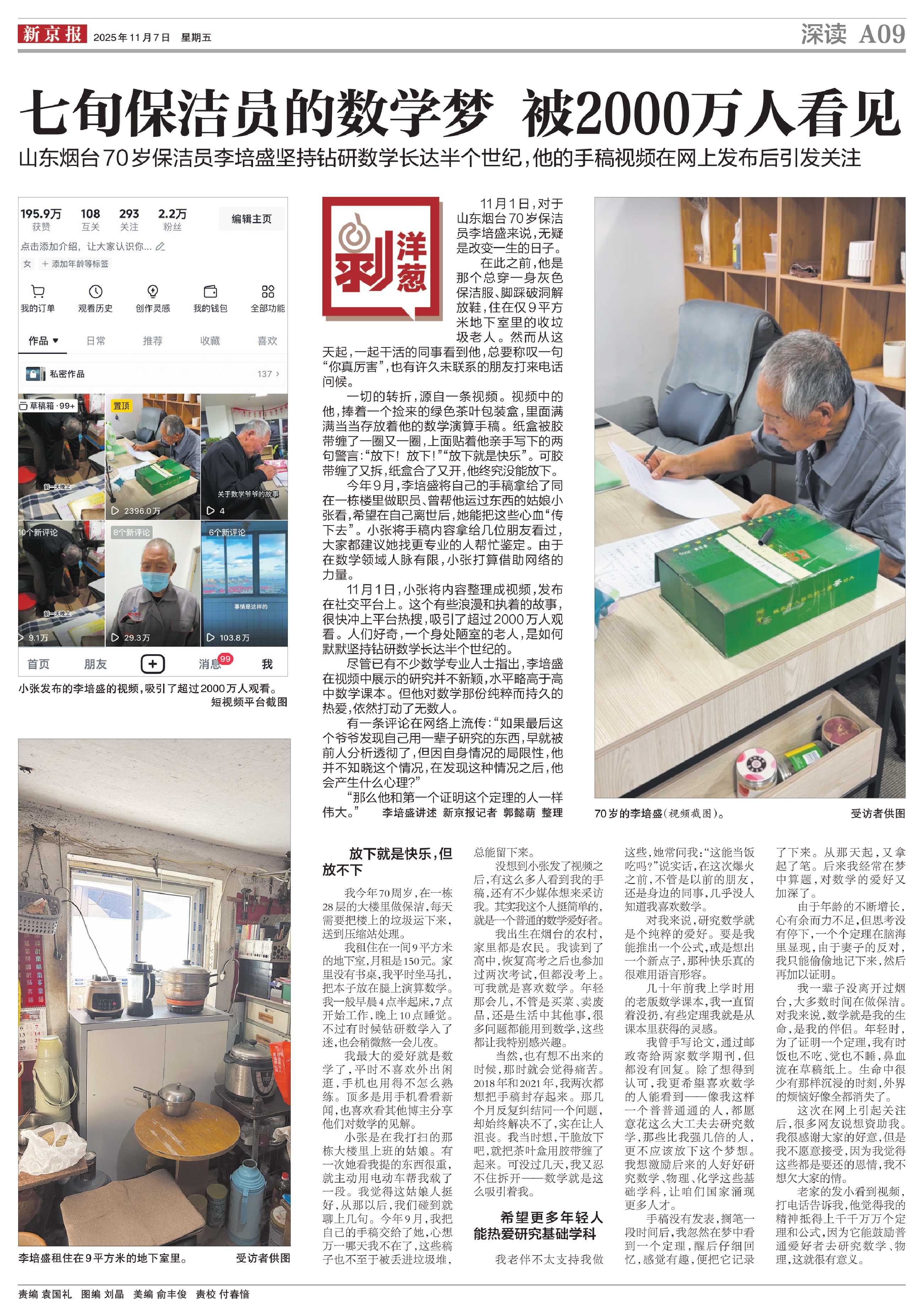 在此之前,他是那个总穿一身灰色保洁服、脚踩破洞解放鞋,住在仅9平方米地下室里的收垃圾老人。然而从这天起,一起干活的同事看到他,总要称叹一句“你真厉害”,也有许久未联系的朋友打来电话问候。