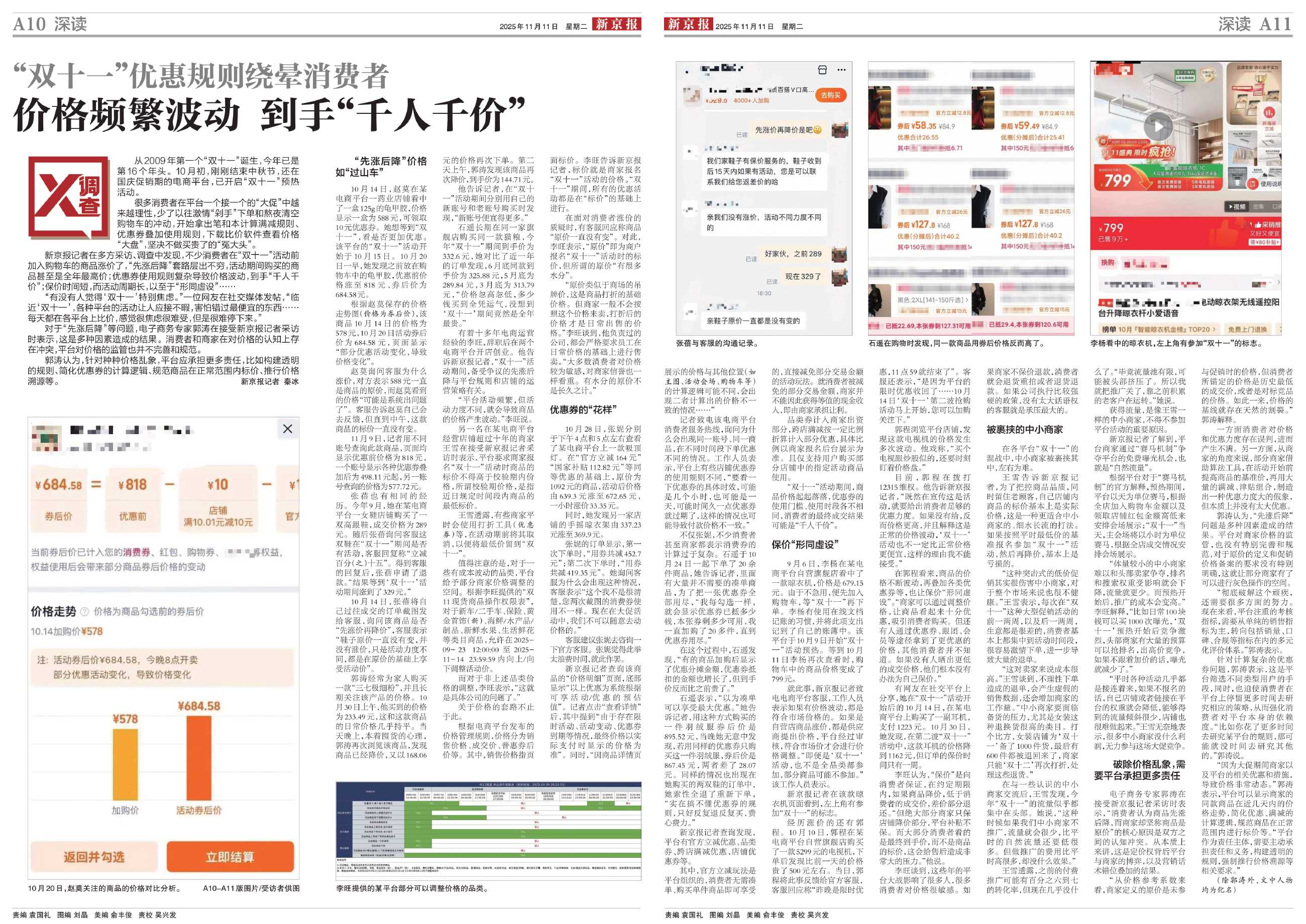 “双十一”活动期间,商品价格起起落落,优惠券的使用门槛、使用时段各不相同,消费者的最终成交结果可能是“千人千价”。
