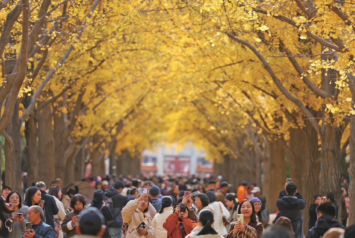 场景:前来银杏大道打卡美景的游客络绎不绝。