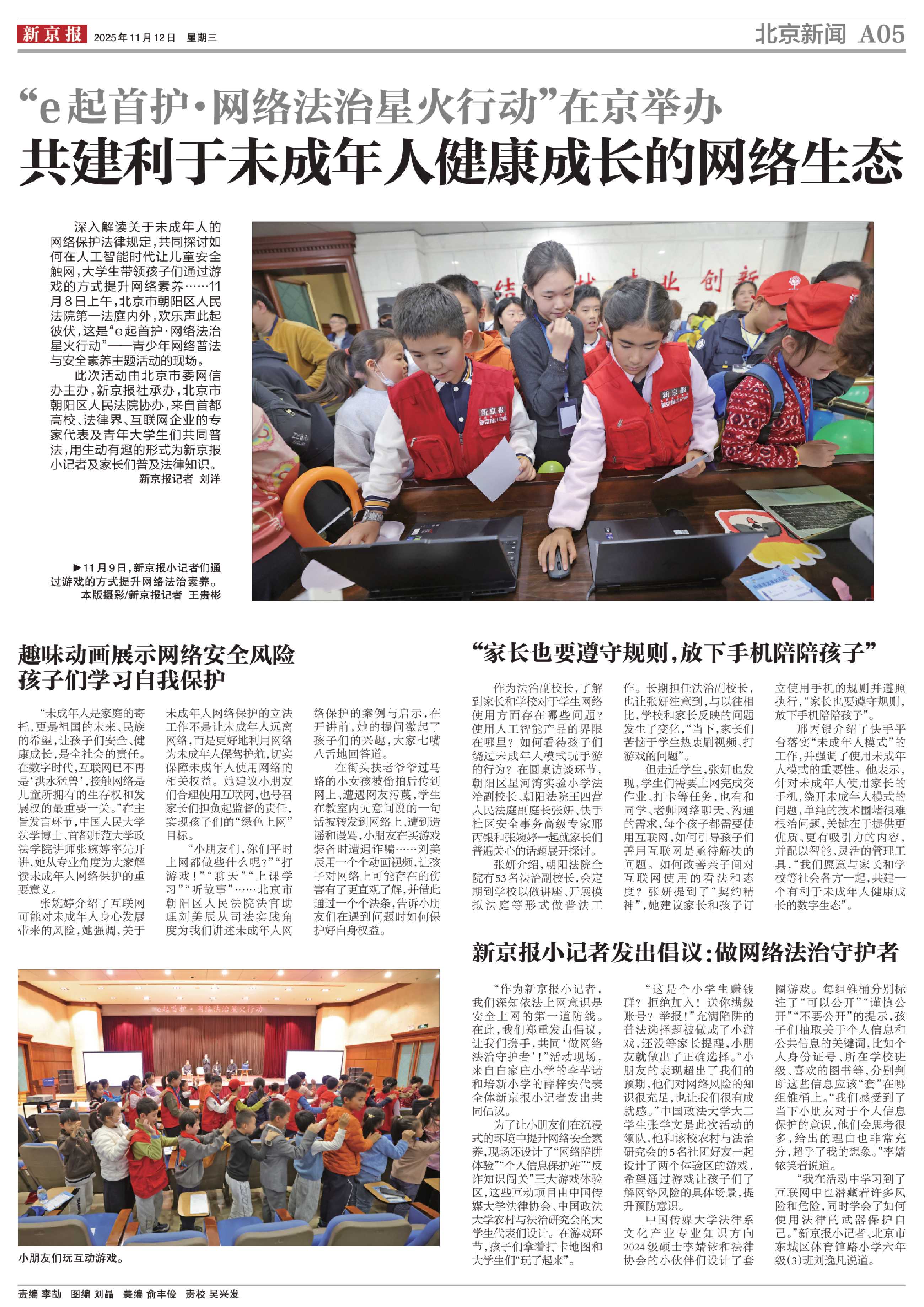 深入解读关于未成年人的网络保护法律规定,共同探讨如何在人工智能时代让儿童安全触网,大学生带领孩子们通过游戏的方式提升网络素养……11月8日上午,北京市朝阳区人民法院第一法庭内外,欢乐声此起彼伏,这是“e起首护·网络法治星火行动”——青少年网络普法与安全素养主题活动的现场。